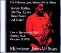 フュージョン・ブームで沸く1970年代ジャズ・シーンの影で、ストレートなジャズを聴きたがっていたファンの溜飲を下げた77年の“VSOP”に続き登場した、ロリンズ、タイナー、ロン、フォスターにより編成された超大型コンポ“マイルストーン・ジャズ・オールスターズ”による1978年10日ボストン公演が、ステレオ感ある高音質サウンドにて2時間半に渡り完全収録した2枚組が初登場!当時のジャズ界は全世界的にフュージョン一色で、ジャズ界を代表するハービー、チック、ショーター、トニー、ロリンズ、ジョーヘンら大御所までもが例に漏れずロックやブラックやラテン・ミュージックを融合したフュージョン・シーンの中で活躍していました。しかし1976年ニューヨークに於けるニューポート・ジャズ・フェスティバル特別企画“ハービーの音楽履歴を回顧する”ステージの中で、マイルスとフレディ・ハバードを置き換えたらまんま1960年代の“黄金のクインテット”復活によるパフォーマンスが行われ大評判となり、これを機にジャズ界はフュージョンから一気にメインストリームなストレート・ジャズへと原点回帰することとなる。そんななかで、テナーの巨人ロリンズのワン・ホーン、コルトレーン亡き後に自らの音楽に新境地を切り開いたマッコイ、新旧マイルス・グループの屋台骨を支えたロンとフォスターが一堂に介し結成されたスーパー・クァルテットがこの“マイルストーン・ジャズ・オールスターズ”でした。一期一会の名手達が織り成す本格的なジャズは、当時VSOP以上の話題を呼び、オフィシャル盤「イン・コンサート」としてもリリースされました。しかしオフィシャル盤は様々なコンサートから編集されたもので、やはり同一会場に於けるワン・コンサートを完全に収録した本作は聞き逃せません!特にオフィシャル盤では聴けない、この4人による最高の名演奏と断言したいコルトレーンの「インプレッションズ」は素晴らしすぎます。一点の曇りも迷いも皆無状態のロリンズの男気溢れる豪放なテナーの吹きっぷりや、マッコイの本領発揮な超絶ピアノ、いつでもどこでも最高のロンの重低音ベース、そしてマイルス75年の一時引退後燻っていたアルのシーン復帰の契機となったこの時のツアーは、エルヴィンやトニーなどの偉大なる先達に勝るとも劣らない凄まじいドラミングが熱すぎです!アコースティック・ジャズ・リバイバルがVSOPによって高らかに宣言された70年代後半、もうひつの“金字塔”の“マイルストーン・ジャズ・オールスターズ”の白熱したコラボレーションをお楽しみ下さい!
