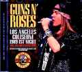 あの絶対名手マイク・ミラードがGUNS N' ROSESを録音していた! ロック史の怪物と録音史の怪物が一堂に会した奇跡の記録が緊急リリース決定です!!そんな本作に永久保存されているのは「1989年10月18日ロサンゼルス公演」。その超極上オーディエンス録音です。「ミラードとGUNS」は意外な組み合わせのようですが、実は熱心な隠れファンだった……というわけでもない。どんな謎を解き明かすにも、まずは何よりアリバイの確認。当時の活動概要から紐解き、本作のポジションを確かめてみましょう。1989年・1月30日:AMERICAN MUSIC AWARDS出演・10月11日:キャットハウス公演・10月13日:パークプラザ・ホテル公演・10月18日ー22日:ロサンゼルス(4公演)←★ココ★1990年《1月13日『USE YOUR ILLUSION』制作開始》・4月7日:FARM AID出演《スティーヴン・アドラー離脱》従来録音とは異なるミラードの大元カセットが新発掘 これが1989年の/1990年のGUNS N' ROSES。“APPETITE FOR DESTRUCTION Tour”のメインは前年12月の初来日/オセアニアで終了していたわけですが、10ヶ月も開けてからわずか4公演(+ウォームアップ2公演)だけ再始動。これはTHE ROLLING STONESの“STEEL WHEELS Tour”のサポート。“LAメモリアル・コロシアム”4夜連続公演のオープニング・アクトとしての特別公演でした。そう、本作はストーンズの名盤『LOS ANGELES 1989 1ST NIGHT: Mike Millard Master Tapes』と同じ日・同じ会場。ミラードはメインのストーンズだけでなく、前座のガンズも記録していたのです。また、このショウはガンズ側コレクターにとってもお馴染み。以前から『LOS ANGELES COLISEUM 1989』が定番となってきました。今回の新発掘はその大元……ではない。絶対名手ミラードによるまったくの別録音なのです。そして、そのサウンドは「同じショウでもミラードが録るとこうまで違うのか」と改めて絶対名手のスゴ味を思い知らされる業物。復活ストーンズ&時代の寵児ガンズの揃い踏みとあって凄まじい熱狂が吸い込まれており、その大歓声の中から演奏を拾い出して聴くような感覚でした。ところが、ミラード作の本作は極太な演奏音/ヴォーカルが強烈。開演シーンを聴くと従来録音とさして違わない熱狂にも思えるのですが、いざアクセル・ローズが登場して話し始める(そう、この日は「One In A Millionスピーチ」で有名なあのショウです)と極太な声がすべてを席巻する。そして、サウンドボードのように主役の座を譲らぬ演奏音は、同じ会場とは思えないほどの支配力です。しかも単に力強いのではなく、すべてのノートが鮮やか。この日の「Move To The City」ではダフ・マッケイガンの弟マットを中心とした“Suicide Horns Section”が登場するのですが、「なんか鳴ってる」的だった従来録音に対し、本作はホーンの色気までしっかりクッキリ描かれています。不穏スピーチも事件もスリリングなクラシックGUNSの最末期 そして、そんな絶対名手サウンドで描かれるのは「クラシックGUNS」最後の輝き。上記の日程をご覧の通り、翌1990年にはスティーヴン・アドラーが去って『APPETITE FOR DESTRUCTION』ラインナップが崩壊。その前にいくつかのイベント出演もあるものの、本式のコンサート・ライヴはストーンズの前座だったロサンゼルス4公演が最後でした。そして、本作にもその予兆がクッキリ。前述のように曲ではなくアクセルの不満爆発MCから始まります(「One In A Million」の歌詞についてのメディア報道にムカついていたようです)し、1曲「It's So Easy」をやっただけで「踊るのを止めないとこれがGUNS最後のショウになるぞ!」とひたすら機嫌が悪い。して、3曲「Out Ta Get Me」では事故が発生。アクセルが足を踏み外してステージから落下してしまう。そもそも機嫌が悪かったのでふて腐れかねない失態にヒヤッとしますが、特にそうはならなかった。単に気にしなかったのか、逆に気合いが入り直したのか。それ以降のアクセルはナゼか不機嫌な態度を見せることなく、ショウに集中。歌いっぷりもグッと良くなるから不思議です。デビュー当時のGUNS N' ROSESは復活AEROSMITHと共演するレーベル・メイトでしたが、さらに始祖であるTHE ROLLING STONES再興のサポートも務めていた。本作は、そんなガンズだからこそ残された絶対名手の超極上ライヴアルバムなのです。本作自体がガンズの超名盤であり、ストーンズの名盤と合わせることで当日の完全体験もできる。ガンズ、ストーンズ、そしてミラードのファン。誰にとっても必聴・必携の新名盤。「1989年10月18日ロサンゼルス公演」の超極上オーディエンス録音。“STEEL WHEELS Tour”のサポート公演で、メインのストーンズと同じく絶対名手ミラードによる大元マスター起こし。従来盤『LOS ANGELES COLISEUM 1989』とはまったく異なる別録音で、本作は絶対名手の名に恥じないサウンドボード級の超絶クオリティ。クラシックGUNS崩壊寸前の最末期を超極上体験できる衝撃の新名盤です。Los Angeles Memorial Coliseum, Los Angeles, CA, USA 18th October 1989 TRULY PERFECT SOUND 驚愕のミラード・マスター…初登場