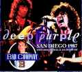蜜月の終末にあったDEEP PURPLEと、ブライアン・ハウと再始動を果たしたBAD COMPANY。両雄を超極上サウンドで真空パックした話題の初登場マスター・セットが登場です!そんな本作に吹き込まれているのは「1987年5月29日サンディエゴ公演」。DEEP PURPLEのフルショウをDISC 1-2に、BAD COMPANYをDISC 3に配した新発掘オーディエンス録音3枚組です。当時はDEEP PURPLEによる“THE HOUSE OF BLUE LIGHT Tour”の一幕で、BAD COMPANYはそのオープニング・アクトでした。実のところ、この日はDEEP PURPLEにとって歴史的な重大ターニング・ポイントでもありました。その辺の意味をご説明するためにも、まずはPURPLE側の活動概要からショウのポジションに迫ってみましょう。1987年《1月12日『THE HOUSE OF BLUE LIGHT』発売》・1月26日ー2月28日:欧州#1(22公演)・3月3日ー3月8日:英国(5公演)←※英国3部作・4月15日ー5月30日:北米#1(28公演)←★ココ★&公式《5月30日:リッチーが左手を負傷》・8月19日ー9月7日:欧州#2(12公演)←※公式NOBODY'S PERFECT 1988年《6月『NOBODY'S PERFECT』発売》・7月31日:MONSTERS OF ROCK ITALY出演・8月11日+16日:北米#2(2公演)・9月9日ー29日:欧州#3(14公演)再編DEEP PURPLE最後の名演 これが1987年/1988年のDEEP PURPLE。本作のサンディエゴ公演は「北米#1」の27公演目でした。このポジションこそが、ターニング・ポイントの要。実は、本作の翌日「5月30日フェニックス公演」でリッチーがギター・クラッシュの際に指を骨折し、ツアーが中断してしまったのです。上記のように3ヶ月弱でツアーは再開されるのですが、残念ながらその頃にはリッチーとギランの関係が悪化。もちろん『THE HOUSE OF BLUE LIGHT』制作段階から悪化していたとも言われますが、それでもステージに立てばライヴを楽しむ名演が残されてきました。ところが、この骨折を期にライヴはおざなりになり、そのまま第五期の終焉へと向かってしまうのでした。そして、本作はそんなトラブルの直前、つまり、本作は再編DEEP PURPLE最後の名演を楽しめるライヴアルバムなのです。従来録音とはまったく別の新発掘コレクション そんな大転換の現場は以前から名録音も知られていたのですが、本作はまったくの別録音。しかも、従来クオリティを大きく更新する初登場録音なのです。その新発掘元となったのは、話題沸騰中の名手「Marco Moir」コレクション。THE FIRMの新名盤『L.A. FORUM 1985』『COSTA MESA 1985』も登場しますが、本作も同じコレクションなのです。そのサウンドは、まさに極上級。従来録音もツアー屈指のクリアさを誇っていましたが、新マスターは次元が違う。オンな芯の密度が高く、ダイレクト感が段違い。大元マスター起こしだからこそダビング痕もなく、ギランのシャウトは鋭く綺麗に伸び、リッチーのトーンも甘露のヴィヴラートが肌感覚で味わえる。しかも、どれだけパワフルに鳴ってもまったくビビらない安定感も絶品。実は激レア曲が美味しいBAD COMPANY篇 そんな輝きの極上サウンドで描かれるのは、レア曲も美味しい両雄のフルショウ。ここでDEEP PURPLE/BAD COMPANYのセットをまとめて整理してみましょう。DISC 1-2:DEEP PURPLE篇・マシン・ヘッド:Highway Star/Lazy/Space Truckin'/Smoke On The Water・ハウス・オブ・ブルー・ライト:The Unwritten Law(★)/Dead Or Alive/Hard Lovin' Woman/Bad Attitude パーフェクト・ストレンジャーズ:Perfect Strangers/Knocking At Your Back Door・その他:Strange Kind Of Woman/Child In Time/Difficult To Cure(★)/Woman From Tokyo ※注:「★」印は公式『NOBODY'S PERFECT』で聴けない曲。 DISC 3:BAD COMPANY篇 ・フェイム・アンド・フォーチュン:Burning Up(★)/Fame and Fortune/That Girl(★★)/Valerie(★)/Tell It Like It Is ・クラシックス:Movin' On/Rock'n' Roll Fantasy/Feel Like Makin'/Can't Get Enough ※注:「★」印はこのツアーだけの限定曲。特に「★★」印は激レア曲。……と、このようになっています。「The Unwritten Law」をはじめとした『THE HOUSE OF BLUE LIGHT』ナンバーも美味しいですが、それ以上にレアなのがBAD COMPANY。『FAME AND FORTUNE』からの新曲5つはどれも公式『WHAT YOU HEAR IS WHAT YOU GET』では聴けなかったレパートリーばかりです。特に「That Girl」に至っては、たった2回しか演奏されなかった。そんな究極的な激レア曲も極上サウンドで味わえるのです。従来録音を遙かに超えるサウンドで最後の名演を楽しめるDEEP PURPLE篇、激レア曲満載で単なるオマケでは済まないBAD COMPANY篇。どちらもクオリティ/演奏の両面で文化遺産と呼ぶに相応しい新名盤です。これからの発掘も楽しみになってしまう「Marco Moir」コレクションの3枚組。「1987年5月29日サンディエゴ公演」の極上オーディエンス録音。話題の名匠Marco Moirコレクションから発掘された初登場マスターで、従来とは完全別録音。サウンドも大幅にアップグレードしており、オンな芯の力強さや細やかなディテールもツアー屈指。パープルはリッチーが骨折する前日という再編時代の最後の名演で、バドカンは「Burning Up」「That Girl」「Valerie」など激レア曲の宝庫。まさに文化遺産級の3枚組です。Sports Arena, San Diego, CA, USA 29th May 1987