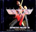 衝撃のデビュー・ツアーに続き、ヘッドライナーとして全世界を席巻した“WORLD VACATION Tour”。その最高傑作として名高い伝説録音のマスター・テープがまさかの新発掘!そんな本作に永久保存されているのは「1979年3月25日フレズノ公演」。その超極上オーディエンス録音です。この録音は、それ自体が伝説。完全サウンドボード級……いや、オフィシャル作品にも喩えられる異次元のサウンドを誇り、ショウ自体も「生演奏版の伝説の爆撃機」と呼ばれる激レアなセット。その凄まじい内容ゆえに長く、広く愛されてきた大定番なわけですが、本作は遂に発掘された大元マスター起こしなのです。何らかの既発を体験された方ならすでに心を決められていると思いますが、そうではない方のためにもイチからご説明しましょう。まずはショウのポジションから……。《3月23日『伝説の爆撃機』発売》・3月25日ー6月10日:北米#1(51公演)←★ココ★・6月14日ー29日:欧州(12公演)・7月5日ー8月26日:北米#2(31公演) ←※WEST PALM BEACH 1979・9月3日ー13日:日本(7公演) ←※OSAKA 1979 2ND NIGHT・9月18日ー10月7日:北米#3(12公演) ←※TUCSON 1979《12月『暗黒の掟』制作開始》伝説録音の大元マスターがまさかの新発掘 これが1979年のVAN HALEN。参考までに各レッグの代表作も付記してありますが、本作のフレズノ公演はそのどれよりも初期。「北米#1」の……というより、“WORLD VACATION Tour”のイの一番である初日にあたるコンサートでした。そんなショウは、何よりも超名録音が残された事で有名。冒頭でもご紹介したように「これのどこがオーディエンス!?」と脳がバグるような完全サウンドボード級の銘品でした。しかし、これまでの最高峰盤であった前回盤『Shades 474』でも、1stジェネ。本作は、それとは異なる当店独自ルートでもたらされた新発掘マスターであり、従来の限界を突破した大元なのです。実際「Feel Your Love Tonight」や「Ice Cream Man」後の曲間など、既発にはなかったパートが含まれ、全体でも約1分20秒ほど長く収録されています。ただし、それはあくまで大元の証拠。肝心なのは全体を貫くサウンドもアプグレードしていること。元々オフィシャル作品に喩えられるほどのサウンドだったわけで何の問題もなかったのですが、比較すると本当にアップしているから驚きです。一番の違いはヒスとナチュラル感。新マスター知った今になって聞き返すと、従来マスターには高音のヒスが乗っていました。別に耳障りなほどのノイズではなかったので欠点とも思われなかったのですが、実はヒスが演奏音自体のキンキン感やヴォーカルのサシスセソ音のトゲトゲしさになっていたのです。ところが、今回はそれがほとんどない。演奏音が楽器の鳴りもナチュラルに轟き、ヴォーカルも滑らか。今まで「現場でもこういう音」だと思われてきたのですが、大元マスターはさらに美しい「真なる現場音」が残されていたのです。VH全史でも1回しかない“生演奏版の伝説の爆撃機” そんなマスター・サウンドで描かれるのは「生演奏版の伝説の爆撃機」と呼ばれてきたフルショウ。その意味をご説明するためにも、ここでセット内容を整理しておきましょう。炎の導火線(6曲)・Runnin' With The Devil/On Fire/Feel Your Love Tonight/Ice Cream Man/Ain't Talkin' 'Bout Love/You Really Got Me 伝説の爆撃機(8曲+α)・Light Up The Sky(★)/Somebody Get Me A Doctor/Dance The Night Away(★)/Beautiful Girls(★)/You're No Good(★)/Outta Love Again(★)/Spanish Fly/D.O.A./Bottoms Up! ※注:「★」印は全世界初演もしくは最古の生演奏。……と、このようになっています。ツアー初日だからこその初演がたっぷりあるあわけですが、それ以上にポイントなのはセレクト。『伝説の爆撃機』から「Women in Love.....」以外の全曲が演奏されているのです(ギターソロも「Eruption」ではなく「Spanish Fly」がモチーフでした)。定番曲まみれのように見えて、実は「2ndアルバムの全10曲中9曲」はこの日1回こっきりなのです。詳しく言いますと、ポイントは3曲「D.O.A.」「You're No Good」「Outta Love Again」が揃っていること。「D.O.A.」は1978年から演奏されているものの、1979年では初日(本作)の1回だけ。逆に「You're No Good」「Outta Love Again」は『伝説の爆撃機』時代だからこそのレア曲で、特に「You're No Good」は1979年にしか演奏していない限定曲なのです(ちなみに、本作で聴けない「Women in Love.....」は1980年が初演ですので、2ndの全曲演奏は実現していません)。「初期VAN HALENコレクションの伝説」そのものだった名録音の大元マスターがまさか発掘されるとは。従来マスターも超極上ゆえにまるで別モノというわけではありませんが、「極み」にあるのは間違いなく本作です。永久に語り継がれなければならない真なる文化遺産アルバム。「1979年3月25日フレズノ公演」の超極上オーディエンス録音。オフィシャル作にも喩えられるような伝説の名録音で、新発掘の大元マスター。従来盤よりも高音ヒスが少なく、そのお陰で演奏音やヴォーカルのナチュラル感も向上。『伝説の