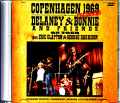 【エリック・クラプトン、ジョージ・ハリスンを巻き込んだLAスワンプの偉大なるバンド、デラニー&ボニーの大定番映像が遂にカラー化!】エリック・クラプトンとジョージ・ハリスンが参加し、デラニー&ボニー&フレンズの大定番映像として高く評価されてきた1969年のコペンハーゲンでのコンサート映像のカラー化が実現しました!元々はモノクロフィルムにて収録されたものですから、それを現代技術により人工着色したというものです。しかしながらこれがとてもナチュラルなタッチで、この時の各メンバーのルックス、楽器のカラーを忠実に再現しており、また新たな感動を生む出来映えとなっています。この素晴らしい映像をご提供します。デラニー&ボニー&フレンズと言えば、60年代後半~70年代初期に活動したLAスワンプの夫婦デュオ・アーティストですが、当時その音楽性に魅せられたエリック・クラプトン、ジョージ・ハリスン、デイヴ・メイスン、ジョー・コッカー、ひいてはローリング・ストーンズまでを巻き込み、米英のロック交流を促進したという点で、ロック史に残る多大な貢献を果たしたバンドでした。中でもエリック・クラプトンの彼らへの惚れ込みようは只事ではなく、69年、成功の真っ只中にあったスーパーグループ、ブラインド・フェイスを捨てて、いちサイドギタリストとして押しかけ加入してしまうほど、彼のキャリアにおける一大転換期となりました。そんなクラプトンが彼らをヨーロッパに紹介すべく尽力して同年に実施したツアーの最終日、69年12月10日にデンマーク、コペンハーゲンのテレビ局がモノクロフィルムにて収録して放送したステージの映像は、古くからアンダーグラウンドでコアなマニアに親しまれてきました。しかし70年代にこの音源が発掘された当時は、ライン録音ながらカール・レイドルのベースとリタ・クーリッジのボーカルが異様に大きなミックスで、逆にクラプトンとハリスンのギターがほぼオフなミックスという劣悪なモノラル音声がまず流出し、それがアナログブート化された後にボケボケの劣悪画質と劣悪音声の不完全収録映像が流出し、それを収めたVHSを長い間マニアはありがたく鑑賞してきたという背景がありました。そんなクオリティでもマニアがありがたがって観てきたのは、クラプトンに加え、ジョージ・ハリスン、ビリー・プレストンまでが参加した豪華なステージ、そこで動く彼らを観たかったからに他なりません。21世紀になって遂にアンコールまで完全収録され、音声ミックスも改善された画質の良いフルステージの映像が発掘され、当店もプレスDVDにてリリースしました。それでもう完璧だと思っていた矢先、何と素晴らしく自然に着色されたカラー版が登場したというわけです。古くからこの映像に親しんでこられたマニアの方も、観ていただくとそのクオリティに驚かれることでしょう。同じ着色映像でも、ビートルズの「A HARD DAY'S NIGHT」のような、「ただ色を塗ってみました」的な人工着色感満開のテイストではなく、非常にナチュラルな色合いで違和感をまったく抱かせない出来映えとなっています。これはマニアも無視できない!【観どころを列挙!!】それではこの映像の観どころを、カラー化された点も含めてランダムに挙げていきましょう。ほんとにたくさんあり過ぎて書ききれないくらいです。メンバー全員の当時のステージ衣装(ルックス)に忠実な着色。この日のカラー写真が複数存在することから、それらを基にステージ後方のカーテンまで、忠実なカラー化が施されています。特にデラニー・ブラムレットが弾くオール・ローズテレキャスターは、ジョージ・ハリスンが彼にプレゼントしたもので、「LET IT BE」セッションで使用し、映画や写真にも捉えられていたあの色合いが正確に再現されています。さらにはジョージがプレイした、「マジカル・ミステリー・ツアー」で有名なペインティング・ストラトも当時のテレビフィルムの褪せた色合いを考慮した自然な仕上がりになっています。クラプトンがベストの下に着ていたシルクシャツの光沢の具合もとても自然です。もちろんメンバーの顔の肌色、髪の色にも不自然さは皆無。クラプトンが3マイクのレスポールカスタムを弾いたのは、この年のジョン・レノンとの「ライブ・ピース・イン・トロント」からこのデラボニ・ヨーロッパツアーまでの4ヶ月間のみ。当時はキース・リチャーズも愛用していた人気のギターでしたが、クラプトンが持つとまた非常にスタイリッシュな輝きを見せています。クラプトンとジョージに色が着いたことで、かっこよさ倍増!端正な二人の姿には誰もが息を飲むこと請け合い!立ち位置的にステージで二人が並んでいたことも奇跡で、時折出てくる二人のツーショットには目も眩みます。・・・・思えばこの友情が22年後にジャパンツアーを実現させたのですね。さらにI Don't Know Whyで、まだ歌うことに自信が持てなかったクラプトンが