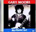 エメラルドに輝くゲイリー・ムーアのオフィシャル映像が世界最高峰クオリティで蘇りました! 本作は、公式映像「LIVE IN STOCKHOLM: WILD FRONTIER TOUR」を復刻したもの。今回のマスターとなったのは、先日Y&Tの「LIVE AT THE SAN FRANCISCO CIVIC」「SUMMERTIME GIRLS & ALL AMERICAN BOYS」を提供してくれたマニアが秘蔵していたVHS。残念ながら、この作品は世界的にレーザーディスクがリリースされず、日本版VHSも出ませんでした。輸入ビデオを熱心にチェックしていたマニアだけが見ることのできたお宝映像なのです。前回のY&Tも異常なほど素晴らしい保存状態でしたが、今回も凄まじい。アメリカ版の輸入ビデオだけに、解像度はレーザーディスクから復刻してきた諸作ほどではありませんが、磁気テープにも関わらず、ヨレもトラッキングノイズもなく、28年間も静かに眠っていた保存状態には舌を巻く。「Wild Frontier」のPVでもお馴染みの黒い衣装に身を包んだ“WILD FRONTIER TOUR”ならではの凛々しいゲイリーが鮮やかに蘇るのです。それ以上に驚きなのは、サウンド。生々しい画面に対して、サウンドは非常に洗練されており、いつになく丁寧に弾き込むゲイリーや控えめな歓声ミックスと相まって、演奏にグイグイと引き込まれるよう。普通は30年近くも経てば再生していなくても劣化があってもおかしくないのですが、わずかな音の歪みもなくロングトーンの美しい響きが耳に流し込まれる。まるでデジタルで記録されているかのように完全なCDレベルのサウンドなのです。そのクオリティで蘇る1987年のショウは、まさに絶品。残念ながら、ショウのフル収録ではないのですが、オフィシャルらしく(?)編集の焦点が絞り込まれており、短いながらもイメージがハッキリとしている。そのイメージは、ずばりアイルランドの薫り高き“WILD FRONTIERの世界”。カットされたのは「Shapes Of Things」「Murder In The Skies」「Victims Of The Future」Wishing Well」といった旧作の4曲で、採用されたのは「RUN FOR COVER」「WILD FRONTIER」の2作が中心。その「RUN FOR COVER」も、「Military Man」「Out In The Fields」といったフィル・ライノットの足跡をしっかりと遺されている。そこにフィルへ捧げた「WILD FRONTIER」が絡んでいくのですから、それはそれはもう「EMERALD AISLES」以上にエメラルドの島への想いが募ってこぼれ出すステージなのです。その美しさが、かの大名盤「WILD FRONTIER」以上に染みるのは、生演奏ならではの熱さがあるからでしょうか。ドラムマシンを使った「WILD FRONTIER」とは違い、ここではKISSでお馴染みのエリック・シンガーがスツールに座り、ボブ・デイズリーも彼ならではのフレーズを次々とキメていく(ちなみに、この2人はBLACK SABBATHの名盤「THE ETERNAL IDOL」のリズム隊です)。大名盤「WILD FRONTIER」は、その素晴らしさと共に「ドラムマシンじゃなかったら……」と語られますが、それが現実のものとなって広がる! 生ビートで駆け抜ける「Thunder Rising」、熱いパッションが弾ける「Wild Frontier」、「RUN FOR COVER」の「All Messed Up」も、スタジオ・バージョンを遙かに超える躍動感。どの曲も、ゲイリーの感情任せの弾き倒しや気ままなロングトーンに自在に呼応する生リズム隊との呼吸感がたまらないのです。「The Loner」に至っては長く長く伸張され、熱く顔で弾き込んだかと思えば、軽くつま弾きでスッと引いて、生バンドならではのドラマティシズム全開で爆発。ぶっといチョーキングはもちろんのこと、マシンガン連射でも泣いて泣いて泣き倒し……もう、もう、もうっ!……失礼いたしました。本作では、さらに当時のプロモーションビデオも3曲ボーナス収録。これまた極めて美麗画質・音質で、アナログ時代のPVだというのに曲名テロップまでクッキリ。MTV大全盛のヴィジュアル時代に独特なアイリッシュ・イメージで切り込んでいったゲイリーの姿がまとめて観られる。ロック、フュージョン、ブルース、ドラムンベース……時代時代でさまざまな顔を見せてくれ、その総てで極上のギターを聴かせてくれたゲイリー・ムーア。しかし、彼以外の誰にもできない音楽と言えば、“アイリッシュ・メロディのHR”を置いて他にありません。最晩年の彼が還ろうとしていた、エメラルドの音楽。本作は、そのライヴを収めたオフィシャル映像を、可能な限りの手段を尽くして蘇らせた1本です。大名盤「WILD FRONTIER」世界の生演奏バージョン。Live at Johanneshov Isstadion, Stockholm, Sweden 25th April 1987 (71:12) 1. Over The Hills And Far Away 2. Thunder Rising 3. Wild Frontier 4. Military Man 5. So Far Away 6. Empty Rooms 7. All Messed Up 8. Out In The Fields 9. Rockin' Every Night 10. The Loner (12:44) Promo Videos 1. Over The Hills And Far Away 2. Wild Frontier 3. Friday On My Mind Gary Moore - Guitar, Vocal Neil Carter - Keyboard, Guitar, Vocal Bob Daisley - Bass Eric Singer - Drums PRO-SHOT COLOUR NTSC Approx. 84min.