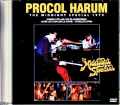 数々の秘宝映像を残したアメリカの伝説番組“The Midnight Special”。そのPROCOL HARUM特集回が究極クオリティ版で復刻。“The Midnight Special”は、まさに伝説の音楽番組でした。1972年8月から1981年3月までNBCで放送された深夜番組で、70年代のスター達の秘宝映像を放送。個性な番組内容も相まって、アーカイヴ映像は現在でも秘宝扱いとなっている音楽バラエティの傑作番組です。話題のオフィシャル発掘で甦る70年代のお宝映像 最大のポイントは、生演奏主体であること。70年代初期の音楽番組と言えば、マイムが当たり前。生演奏は収録の手間がかかる上に事故も起こりやすく、時間も読めないので敬遠された時代でした。そんな中で“The Midnight Special”は番組独自の生演奏にこだわって人気を博しました。この点は時が経つほどに重要視されるようになり、70年代に旬を迎えていた輝ける映像が大量に残されることになったのです。そんな伝説番組ですが、実は50年の時を超えた現在、再び脚光を浴びています。その原因は最高峰マスターの発掘。番組の公式チャンネルがアーカイヴ映像を次々と公開し始めたのです。そして、そのクオリティが衝撃! 本家本元の所蔵マスターだけあって、これまで知られてきたどんなマスターよりも美麗。もちろん、証明やセットには70年代の時代感が宿っていますが、劣化ゼロで瑞々しい鮮度には50年の時間が存在しなかったかのように美しいのです。旬のアーティスト4組による貴重パフォーマンスの数々 そんな話題の発掘シリーズの中でも、本作は“1973年11月30日”に放送された「Episode 44」。PROCOL HARUM特集回をDVD化したものです。ホストはPROCOL HARUMが務めていますが、他にもHUMBLE PIEやアルヴィン・リー&マイロン・ルフェーヴル等も出演。全13曲に及ぶ貴重なライヴ映像を約68分に渡って楽しめるのです。番組は1曲ずつ入れ替わる構成ですが、ここではバンド/アーティスト毎に分けてまとめてみましょう。PROCOL HARUM(6曲)・グランド・ホテル:Grand Hotel/Fires (Which Burnt Brightly)/T.V. Caesar・その他:Conquistador/Whiter Shade Of Pale/Drunk Again 一番多いのは、「Episode 44」の主役であるPROCOL HARUM。当時は『GRAND HOTEL』リリースの8ヶ月後というタイミングで、当時の新曲を軸に6曲を披露しています。「T.V. Caesar」のライヴが観られるのも貴重ですが。それ以上なのが「Drunk Again」でしょうか。シングル『Nothing But The Truth』のB面として発表される曲で、当時は未発表の新曲。生演奏自体、数えるほどしか確認されていないレア曲です。HUMBLE PIE(3曲)・Oh La De Da/I Don't Need No Doctor/30 Days In The Hole ゲスト出演は3組で、メインのPROCOL HARUMの次に登場するのがHUMBLE PIE。当時の彼らは『EAT IT』の7ヶ月後にあたり、アルバムにも参加した女声コーラス・グループTHE BLACKBERRIESとの連名出演でした。実際、番組ではTHE BLACKBERRIESもかなりフィーチュアされている。クレム・クレムソン/グレッグ・リドリー/ジェリー・シャーリーも映るには映りますが、ほぼほぼヒゲ面のスティーヴ・マリオットとTHE BLACKBERRIESがメインになっている。この辺も70年代らしさなのかも知れません。アルヴィン・リー&マイロン・ルフェーヴル(3曲)・Rockin' Till The Sun Goes Down/Carry My Load/The World Is Changing HUMBLE PIEと並ぶ3曲なのがアルヴィン・リー。ただし、TEN YEARS AFTERではなく、ゴスペル歌手マイロン・ルフェーヴルとのコンビとして出演しています。当時は、彼らのコラボ・アルバム『ON THE ROAD TO FREEDOM』の発売直後(28日後)でもあり、プロモーションらしくマイクを並べてアルバム曲を熱唱しています STEELEYE SPAN(1曲)・Cam Ye O'er Frae France 3組目のゲストは英国のフォークロック・バンドSTEELEYE SPAN。彼らも『PARCEL OF ROGUES』の7ヶ月後にあたる出演で、アルバムからスコットランド民謡を披露。当時26歳だったマディ・プライヤーが軽やかに歌い踊る姿が楽しめます。以上の4組・全13曲の秘宝集です。バラエティ番組とは言っても寸劇もなければトークもなし。ホストのPROCOL HARUMも軽く紹介するだけで、ほぼほぼ熱い生演奏で埋め尽くされた約68分間です。『GRAND HOTEL』や『EAT IT』が生々しかった時代の熱風がモニターから溢れ出す映像傑作。伝説の音楽番組がリリース。公式チャンネルが公表した超極上の大元マスターで、PROCOL HARUMの他、HUMBLE PIEやアルヴィン・リー等、多彩なゲスト達の黄金時代を楽しめる文化遺産映像です。Episode 44 / 30th November 1973 1. Intro 2. Procol Harum – Conquistador 3. Humble Pie with The Blackberries - Oh La De Da 4. Alvin Lee and Mylon LeFevre - Rockin' Till The Sun Goes Down 5. Procol Harum - Whiter Shade Of Pale 6. Procol Harum - Grand Hotel 7. Humble Pie with The Blackberries - I Don't Need No Doctor 8. Alvin Lee and Mylon LeFevre - Carry My Load 9. Procol Harum - Fires Which Burn Brightly 10. Procol Harum - Drunk Again 11. Humble Pie with The Blackberries - 30 Days In The Hole 12. Steeleye Span - Cam Ye O-er Frae France 13. Alvin Lee and Mylon LeFevre - The World Is Changing 14. Procol Harum - T.V. Caesar PRO-SHOT COLOUR NTSC Approx.68min.