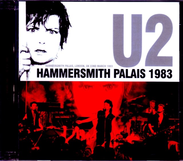 以上、全110公演。本作のロンドン公演は「欧州#1」の21公演目にあたる。『WAR』リリースから約1ヶ月というタイミングのコンサートでした。現場となったのは、2,000人規模の“ハマースミス・パレス”。「1983年」「ハマースミス・パレス」というと、当店のプレスCD『WAR TOUR』を思い起こすマニアもいらっしゃるかも知れませんが、本作は別公演。『WAR TOUR』は「3月29日」であり、本作はその1週間前なのです。そんな本作のクオリティは、名盤の誉れ高き『WAR TOUR』にも肉薄する素晴らしいオーディエンス録音。最近になって発掘されたマスター・カセットからダイレクトにデジタル化されたもので、その鮮度は35年前とは思えない瑞々しさ。鮮度だけでなく録音自体もバツグンで、骨太でディテールまで鮮やかな楽音は「まるでサウンドボード」と言うより、「ほとんどFM放送」。ボノの歌声は距離感ゼロですし、ジ・エッジのギターワークはピッキングニュアンスまで超鮮明。アダム・クレイトンのベースも1粒1粒までクッキリ。デジタル録音大全盛の現代であっても、ここまでのクリア&ダイレクト録音はそうはない……そんな次元の名録音なのです。そんなサウンドで描かれるショウは、まさに駆け上がる若々しい情熱が燃え上がるよう。先ほどツアーの概要を掲載しましたが、本作の「欧州#1」はヨーロッパとは言うものの、大陸公演は最終日のフランス1回だけ。残り28公演は英国全土の小会場をくまなく回るという、絨毯爆撃的なツアー。実際、2,000人規模の“ハマースミス・パレス”でも3回演奏していました。そんなツアースケジュールに象徴されるように、この時期のU2は徹底的にライヴ漬け。回数だけでなく、その1回1回に大名盤『WAR』を創り上げたバンドポテンシャルそのままに、まだ20代前半の情熱が滾っているのです。このツアーからは公式作品『UNDER A BLOOD RED SKY』も制作されましたが、本作には公式版にはない「I Fall Down」「Tomorrow」も味わえるフル収録。しかも、その「Tomorrow」や「Sunday Bloody Sunday」では、『WAR』にも参加したスティーヴ・ウィックハンがヴァイオリンを聴かせてくれるのです。熱い演奏、超の付く名曲ラッシュ、そして貴重なゲスト共演。そのすべてが極上のサウンドで描かれるライヴアルバムの理想郷です。大名盤『WAR TOUR』にも匹敵する名録音が、もう1本存在していたとは……。