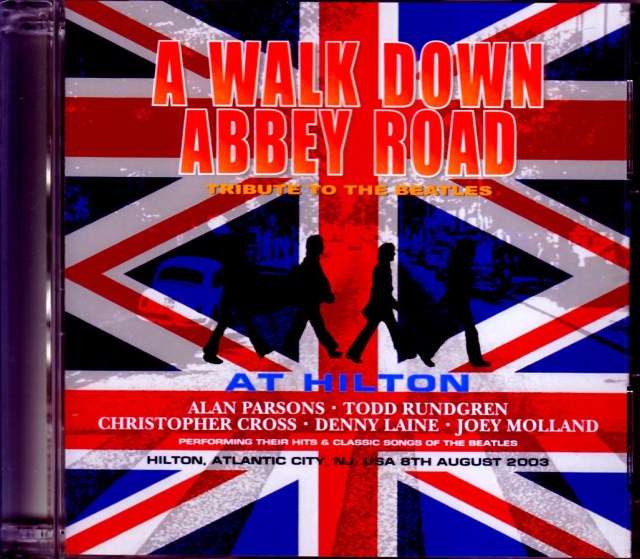 第三期 A WALK DOWN ABBEY ROAD の驚愕音源を収録。2003年8月8日、アトランティック・シティー、ヒルトンでのライブを、何と、ステレオ・サウンドボード録音で完全収録。3回のみ行われた第三期によるライブですが、本公演を含むヒルトン2夜連続公演のみ、ファン垂涎のメンバーを迎えての究極のライブが行われました。まずオープニングはビートルズのカヴァーからスタート。曲が始まった瞬間に驚かれると思いますが、ツアー真っ只中のアラン・パーソン・プロジェクトをバックに従えての演奏は、スタジオ収録盤と勘違いしてしまうクオリティと音質です。続いてジョーイ・モランドをメインに迎えてのステージ。ファンには感慨深いであろうバッドフィンガーの代表曲を含むセットで聴衆を魅了していきます。続くデニー・レインのセットでは何とムーディー・ブルースの「Go Now」とウィングスの代表曲を披露。ボーカルに若干違和感が残る物の、あの癖のある間合を含んだギター・サウンドはやはり彼だけが出せるタイム感だと納得させられる演奏を聞くことが出来ます。続いての主要メンバーとなるトッド・ラングレン、クリストファー・クロス、そしてアラン・パーソンズのステージは、各々の代表曲で全ロック・ファンを、コアなセレクトのカヴァーでディープなファンを納得させると同時に、MCからも伺える通り自らのビートルズに対する親愛振りを誇示するステージが展開されています。そして後半「Back In The USSR」から続くカヴァーではこれ以上望めないメンバーによる最高の演奏を聞くことが出来ます。音質は完璧なクオリティのステレオ・サウンドボード録音で全編が収録され、各楽器のバランス及びステレオ感も申し分ありません。今までオーディエンス録音を含め、全くそのステージを知る事ができなかった第三期 A WALK DOWN ABBEY ROAD のステージが、2008年になって忽然と出現、しかも最終決定版となるタイトルが登場です。