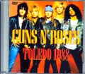 1988年1月から3月のモトリー・クルー、デイヴ・リー・ロス、5月後半のアイアン・メイデンのオープニング・アクトとしてのツアーの間に、4月後半から5月前半にかけて、UDO, Zodiac Mindwarpをゲストバンドに行われたヘッドライナー・ツアーより、5月1日のオハイオ州トレド公演を高品質なオーディエンス・ショット映像で1時間16分に渡って完全収録したファン必携・必見映像が登場です。「Appetite For Destruction」が空前のヒットを記録する中で行われた、まさに上昇気流まっしぐら、バンドにとっても最良の時期を捉えた貴重な記録映像です。カメラはステージ向かって右側からバンドをほぼ完璧なショットで捉えており、巧みなカメラワークはバンドの魅力的なパフォーマンスをこれ以上ない程リアルに再現してくれます。音声も十分な高音質で収録されており、この時代のオーディエンス映像でありながら、殆どストレスを感じさせない、実に見事なクオリティを誇る必見の一枚。画質もマスターをそのままデジタル化したのかと思えるほどに良好です。「Appetite」時代の5人がステージ狭しとキビキビしたアクションで演奏する様は本当に圧巻で、ファンは一瞬たりとも見逃せない魅力的なシーンが連発します。4曲目のOut Ta Get Me前にアクセルが長めのMCを行いますが、その中で両親とのコミュニケーションの難しさを観客に問いかけます。(昨晩のイリノイ州でのライブにアクセルの両親が来てくれたが、未だに彼らは自分たちが何をやってるのか理解できないみたいだ、と言います。)中盤、スラッシュの3分弱のジミー・ペイジを思わせるフリーフォームのソロに続いては、バンド全体が加わっての5分近いブルースジャムが繰り広げられます。スラッシュ、イジー、ダフがステージ中央で接近して熱演する様に、ファンは惚れ惚れして見入ってしまうことでしょう。Patienceの前にはアクセルの「この曲を次のEPシングルに入れようか、次のアルバムに収録すべきなのか迷ってる」というMCが聞けます。メインセットのラストは、アクセルがお馴染みのポリスキャップにセクシーな上半身裸で歌いまくるWelcome To The Jungle。アンコールのParadise Cityまで、キビキビとしたステージの流れがこの時期らしく堪りません。ラストにほんの少しですが、終演後の会場の様子が写ります。時期、選曲とあらゆる点から見て、バンドののベストな状態を捉えた決定版・初登場映像が登場です。