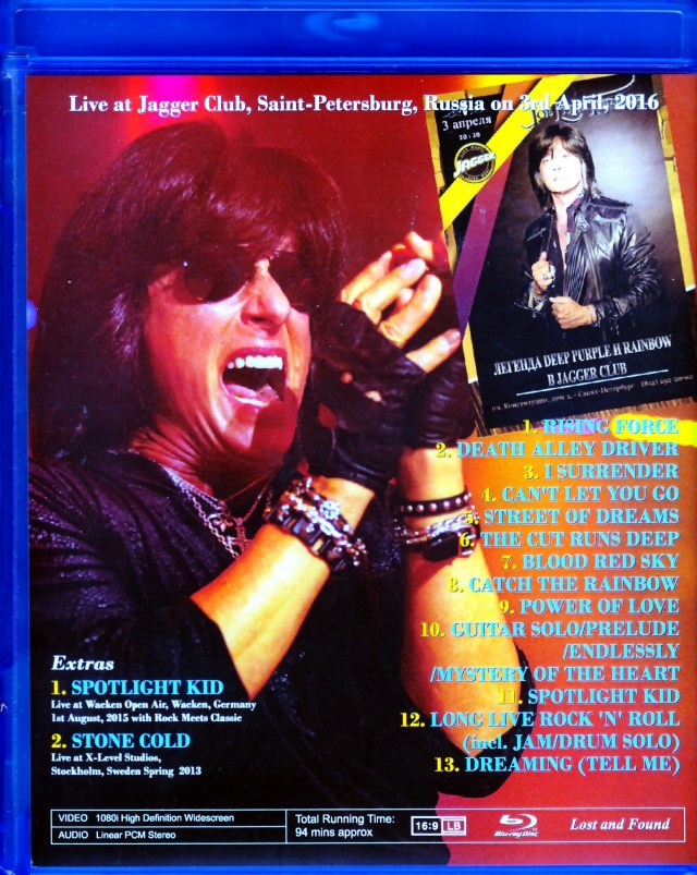 1. RISING FORCE/2. DEATH ALLEY DRIVER/3. I SURRENDER/4. CAN'T LET YOU GO/5. STREET OF DREAMS/6. THE CUT RUNS DEEP/7. BLOOD RED SKY/8. CATCH THE RAINBOW/9. POWER OF LOVE/10. GUITAR SOLO/PRELUDE/ENDLESSLY/MYSTERY OF THE HEART/11. SPOTLIGHT KID/