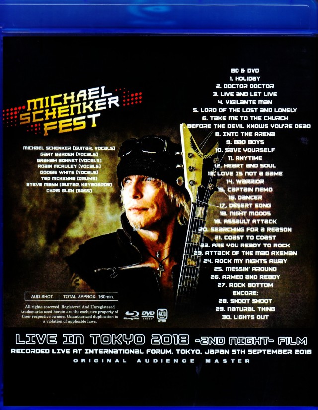 2018年4人のボーカリストを配したマイケル・シェンカー・フェストのジャパン・ツアーより、その最終日となる9月5日東京・国際フォーラムでのライブを、HDクオリティーの良好オーディエンス・ショットにて、2時間40分にわたりコンプリート収録した、ブルーレイとDVDをセットで。まずステージ正面の1F席後方から、前方を見晴らし良好な状態でステージ全体を見事に捉えたもので、Youtubeなどの映像とは雲伝の差。しかも音声パートは、別レコーディングされたデジタル・オーディエンス・ソースをマトリクスしており、特にブルーレイはその大容量を活かし、元素材そのままのHDクオリティーの映像素材を圧縮することなく収録しており、音声も含めてこれ以上のクオリティーは望めないであろうもの。そしてこれまでの全5公演すべてが大絶賛だったジャパン・ツアーもいよいよ最終公演であり、今回のツアーで最もキャパも大きいホールだけに盛り上がりももちろんアタマから最高潮で、ゲイリー・バーデン、グラハム・ボネット、ロビン・マッコーリーに加え、ドゥギー・ホワイトまで加わったライブは、この日もオープニング、スコーピオンズの「Holiday」をシェンカーのボーカルでスタート。その後4人のボーカリストが入れ替わりそれぞれのセクションで登場し、全員全盛期と変わらない安定感溢れるボーカルを披露。その中でもやはり熱狂的に迎えいれられたのは第2セクションでのグラハムで、目玉となった「Searching For A Reason」、そしてゲイリーもMSF初公開となる「Rock My Nights Away」を披露。そして15分近くに及ぶUFOのあの70年代ライブを彷彿させる「Rock Bottom」で本編を終えたあと、4人がマイクを繋ぐUFOナンバーのアンコール・パートは名古屋公演以降3曲で終わっていたのは最終日とも同じながら、大歓声と大熱狂の中エンド。このようにまさにファイナルを飾るに相応しい、ファンにとっては必見の来日限定メモリアル・アイテム。