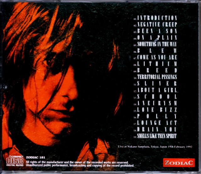 このように、NIRVANA唯一のジャパンツアーは全4公演。先日も日本公演のサウンドボード・アルバム『TOKYO 1992』が大好評を賜りましたが、そちらが最終公演だったのに対し、本作は正真正銘の“初日本”となった大阪公演なのです。そんな記念碑的コンサートの録音は以前から知られ、『BEEN A SOON(9 20214-2)』『MEMORIAL LIVE IN JAPAN 1992(TTKKS 001:川崎とクレジットされていますが、大阪です)』など、様々な既発を生み出した名録音です。もちろん、本作はそんな既発のコピーではなく、大元になったキニー製のマスターDATをダイレクトにCD化したもの。現場で吸い込んできた音、ヴァイヴを1音漏らさず収録したライヴアルバムなのです。実際、本作はどの既発よりも長い全長版。これまでも演奏曲そのものは全曲分公表されていましたが、さらに開演・終演シーン、「Blew」後のMC、「Love Buzz」後にアンコールを待つ熱狂など、今まで聴けなかった“現場音”が5分ほど長く、当日の総てが完全に蘇ったのです。これが何とも見事な“現場感”・“時代感覚”になっている。当時の感覚では演奏に関係ないシーンをカットして聴きやすくしたのでしょうが、このライヴは“NIRVANA唯一の来日”なだけでなく、“日本初のグランジ・コンサート”。当時は「『NEVERMIND』が全米No.1」の報からまだ1ヶ月。「グランジって何だ?」「一体、アメリカで何が起きてるんだ!?」というレベルであり、耳の早いリスナーが「自分で確かめる」と集った現場だった。それだけに、歓声には「見たこともない音楽が始まる」という期待感と緊張感が猛烈に渦巻き、それがノーカットだからこそリアル。先日リリースされた『TOKYO 1992』でも垣間見れた時代感覚ではありますが、オーディエンス録音の本作は、更に特濃なのです。そして、サウンドもオリジナルDATだからこその素晴らしさ。アナログ・カセットからのデジタル化とは違いますので、既発と比べて“目を見張る大変貌”というわけではありませんが、メリハリが利いている。何より違って聞こえるのは、既発では引っ込んで聞こえていたヴォーカル。グッと前に出ており、全体のバランスが良いばかりか、ダイレクト感まで上がって聞こえるのです。これがまた、カート・コバーンの息づかいまで伝えてくれる。なにしろ、この日は当時24歳のカートにとって、初めてのアジア。それまで本国アメリカ/ヨーロッパ/オセアニアでのライヴはあったものの、生まれて初めて見る黒髪の波を前にしたパフォーマンスなのです。それだけに、絶好調のワイルドさというよりは、幾分緊張気味の歌声にも聞こえますが、これこそが歴史の真実なのです。本来であれば、『TOKYO 1992』よりも2曲「Something In The Way」「Lounge Act」多いセットリストをこそ語るべきだったかも知れません。実際、「In Bloom」「Stay Away」「Endless, Nameless」以外の『NEVERMIND』全曲が披露されており、「ライヴバージョンのNEVERMIND」として聴くことも可能です。しかし、やはり。それ以上にむせ返るような時代感覚こそが、現場にしかなかった初対面の呼吸こそが素晴らしい。歴史に1日しかない初日本の初ステージ。1つの音楽ジャンルと日本の出会いを本生100%サウンドで、しかも、キニーのオリジナルDATから復刻した史上最高峰の1本。日本の洋楽史に燦然と輝くドキュメント・アルバム。歴史的な一夜の匂い、どうぞ胸いっぱいに吸い込んでください。