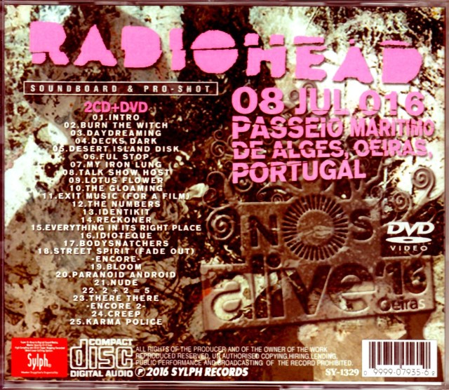 来日間近!!5年振りとなる9thアルバム「ア・ムーン・シェイプト・プール」を発表したレディオヘッドが、ポルトガルで行われたフェスティバル「NOSアライヴ」の2日目にヘッドライナーとして出演!!その2016年7月8日大トリ・ライヴステージを完全収録したサウンドボード&プロショット・アイテムが登場!!CDはプロ級のデジタル・マスターリングが施されたウルトラ・サウンド!!DVDでは味わえない最高音質にてご堪能下さい。この日は、新作からのナンバーが7曲と、「マイ・アイアン・ラング」「トーク・ショウ・ホスト」「イグジット・ミュージック」「ストリート・スピリット」「パラノイド・アンドロイド」「カーマ・ポリス」等の人気ナンバーが登場!!2ndアンコールでは、予定になかった「クリープ」も披露するという好演!!見所タップリの2時間を超える熱狂的野外パフォーマンスは必聴・必見!!