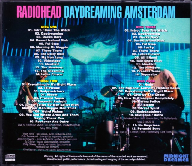 DISC 4 : 01. Nude/02. The National Anthem / Hunting Bears/03. Everything In It’s Right Place/04. Give Up The Ghost/05. How To Disappear Completely/06. Karma Police/07. Bloom/08. Street Spirit/09. Bodysnatchers/10. Idioteque / Outro