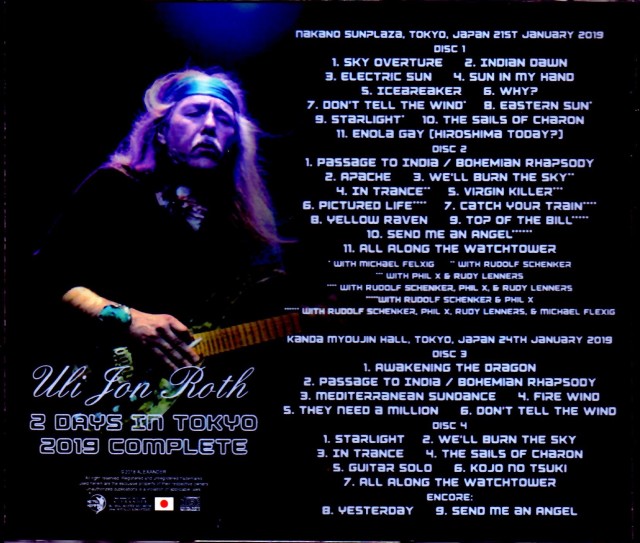 ギター仙人ウリ・ジョン・ロートの2019年来日ツアーより、充実著しい演奏が繰り広げられた東京2DAYSを、両日ともに極上クオリティのオーディエンス録音で完全収録。オリジナルの高品質なマスターを使用した秀逸な音質を誇るアイテムです!まずディスク1とディスク2に収録されているのは、1/21に中野サンプラザでおこなわれたエレクトリック・ショウです。毎度恒例の中野サンプラザ、しかしその内容は唯一無二のスペシャルなものとなりました!ルディが飛び入りした往年のファン感涙のライブ!!とにかく凄すぎる内容です、セットリストをご覧あれ!もちろん音も最高です!!一方ディスク3とディスク4に収録されているのは、1/24に神田明神ホールでおこなわれたアコースティック・ライヴです。フラメンコ・スカイを投入しておこなわれた激レア・ショウ!「地中海の舞踏」の熱演には腰を抜かしたファンも多いはず!!こちらもとにかく凄い音なので是非ともお聴き下さい!さらに、1/21中野サンプラザ公演の一部を美麗オリジナル・オーディエンス・ショットで収録したDVDも付属します。◆収録内容=2019年1/21中野サンプラザ公演+1/24神田明神ホール公演 ◆オリジナル・オーディエンス音源