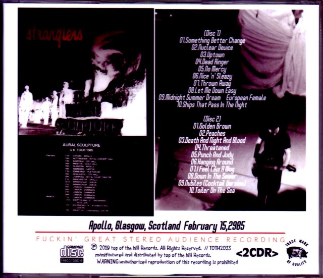 ~8枚目のアルバム『AURAL SCULPTURE』リリース時の85年2月のツアーからグラスゴー公演を高音質ステレオ・オーディエンス・マスターから収録したニューアイテム!!~ホーンセクションを導入して新境地を切り拓いた84年11月リリースの8枚目のアルバム『AURAL SCULPTURE』リリース時の行われたツアーから85年2月15日、スコットランド、グラスゴー、アポロで行われたライブを高音質ステレオ・オーディエンス録音でノーカット完全収録したニューアイテムが登場!当時のものとしては上級クラスのクリアな音質で、音割れもなくヴォーカルはもちろん各パート共に非常にバランスよく収録されています!『AURAL SCULPTURE』からの3曲を含めたセットリストで、シングルカットされた"No Mercy"から間髪入れずにプレイされる"Nice 'n' Sleazy"など鳥肌もののスリリングな極上パフォーマンス!アンコールでは80年にファンクラブ限定でリリースされたシングル『Tommorrow Was The Hereafter』のBサイドトラック"Nubiles (Cocktail Version)"もプレイされています!