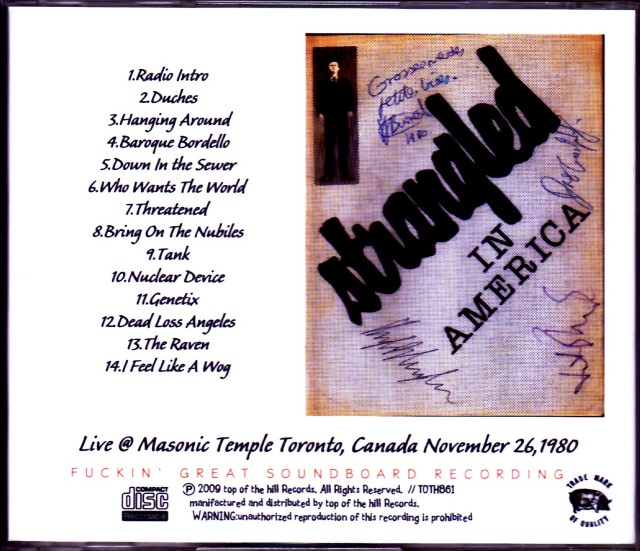 ~これまで全く流通していなかったサウンドボード音源!極上の音質で80年当時のライブをパッケージした逸品!~非常にレアな1980年ライブ音源が初の音源化!これまでコアなマニアの間で密かに流通していた80年のトロントでのFM放送用のサウンドボード音源。放送時のマスター音源に非常に近いテープからダイレクトに収録されたサウンドボード・ソースから全14曲、極上音質でパッケージした秘蔵ライブ盤!トロントのホールでのイベントに招かれたストラングラーズのライブを現地ラジオ局が録音。現在まで眠っていたこの音源。ファンならずとも一度は聴いた事のあるような80年までのストラングラーズの名曲群で構成されたセットリストは今見ても強力!モノラルながらも各楽器のプレイも非常にクリア、ギターとオルガンの絡み、渋いヴォーカルまでくっきり聴き分けられる最高の音質によるサウンドボード録音で楽しめます。緊張感のある漆黒のサウンド、ここにありと言える極上のパフォーマンス、文句無しの選曲、音質も含め非の打ち所のない好ライブ盤!