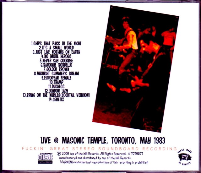 ~深みを増した音楽性の発展を見せた83年の秘蔵ライブ!チャート入りしたヒット曲もプレイする耽美的な叙情溢れるサウンドボード音源!~パンクの時代を経て,ホーンセクションやニューウェーブサウンドの導入で新機軸へと突入。矢継ぎ早のリリースを展開した80年代初頭のストラングラーズ。チャートにもヒット曲を送り込んだ当時のツアーより,83年の北米ツアー、トロントでのライブを現地ラジオ局CFNYによるステレオ・サウンドボード録音マスターからのリマスタリング収録で全14曲をバッチリ収録!ヨーロッパの憂鬱と耽美といったスタイル、ニューウェーブ/テクノの影響も感じさせる前半部分、奥行きと深みのある演奏とヴォーカルが実に聴かせる後半部分、チャート入りしたヒット曲も多い当時のセットリスト、これらの曲で濃密なパフォーマンスを展開しておりこの時期のライブも非常にハイクオリティであることが分かります。この後に失速していくバンドの最後の輝きともいえるリアルなヒリヒリとしたテンションが伝わる1枚!