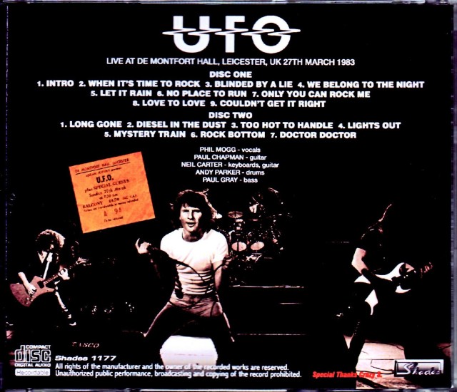 Disc 2(58:00) 1.Long Gone 2. Diesel in the Dust 3. Too Hot to Handle 4. Lights Out 5. Mystery Train 6. Rock Bottom 7. Doctor Doctor Phil Mogg - vocals Paul Chapman - guitars, bass Neil Carter - keyboards, bass, backing vocals Andy Parker - drums Paul Gray - Bass