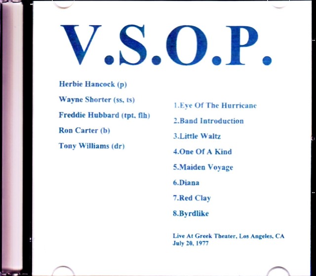 猫も杓子もマイルス・デイヴィスが火を付けたエレクトリック・ジャズへのシフトから、マイルス一時引退後にシーンを再びアコースティック・ジャズへと原点回帰に導き牽引した、V.S.O.P.1977年初の本格的ツアーから稀少な初音源が高音質完全収録にて登場!!!当時プレスからミラクル・パフォーマンスと絶賛された1977年7月19日(20日?)カリフォルニア州ロサンゼルスのグリーク・シアターでの名演奏!!!ステージは期待に膨らむ熱狂的な観客の歓声に応えるべく素晴らしいステージを展開しており、いきなり「アイ・オブ・ザ・ハリケーン」を演奏し、イントロダクションに続き「リトル・ワルツ」からショーターの変幻自在のサックス、そしてフレディの饒舌なトランペットが炸裂し、「ワン・オブ・ア・カインド」「メイデン・ヴォヤージ」「ダイアナ」、ムチャクチャ高テンションなフレディの「レッド・クレイ」、最後の「バードライク」はトニーが大爆発し、このメンバーにしか出来ないモーダルかつ斬新で限りなくフリーフォームなスタイルを基盤とした前衛的なハードバピッシュな演奏を繰り広げている。この時ハービー37歳、ショーター43歳、ロン40歳、トニー31歳、フレディ39歳…まさにジャズ・ミュージシャンとしての絶頂期を迎えた彼らが、他の誰にも真似の出来ないオリジナリティ溢れる渾身のプレイを披露している。この3日後には初開催となる「ライヴ・アンダー・ザ・スカイ」に出演(オフィシャル未発表曲がSo What!盤で聴ける!)し、日本のファンを熱狂の渦へと巻き込む…