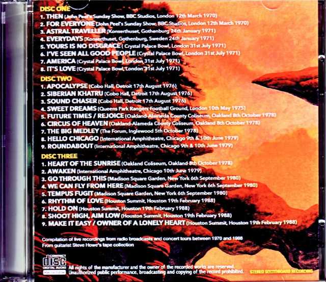 【DISC 1】・1970年3月12日BBC:Then/For Everyone《ピーター・バンクス→スティーヴ・ハウ》・1971年1月24日ヨーテボリ公演(2曲)Astral Traveller/Everydays・1971年7月31日ロンドン(4曲)Yours Is No Disgrace/I've Seen All Good People/America/It's Love