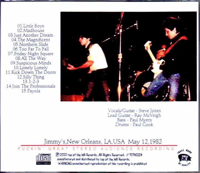 ~スティーヴ・ジョーンズとポール・クックが率いたプロフェッショナルズ、82年ニューオリンズ公演を良好なステレオ・オーディエンス録音で収録!~空中分解したピストルズ以降、スティーヴ・ジョーンズとポール・クックを中心に結成されたザ・プロフェッショナルズの1982年5月12日、ニューオリンズのクラブ、ジミーズで行われたライブを良好なステレオ・オーディエンス録音で収録した秘蔵音源が登場!若干遠目の位置での録音ながらバランスのいい安定感のある良好な音質でリマスタリングによりドライブしまくるギターがより鮮明に堪能出来ます!この時期はザ・クラッシュのツアーのオープニングアクトも行うも、間もなくバンドは解散してしまうという最後期の音源ですが、ピストルズ時代のナンバー"Silly Thing"、エルヴィス・プレスリーのヒットナンバー"Suspicious Minds"のパンキーなロックンロールにアレンジしたカヴァーを含めたセットリストで、『今までライブでプレイしたことのないナンバー』というMCから未発表の激レアナンバー"Lonely Lonely"をプレイ!!キャッチーなメロディと疾走感溢れる軽快なロックンロールナンバー!痺れます!!