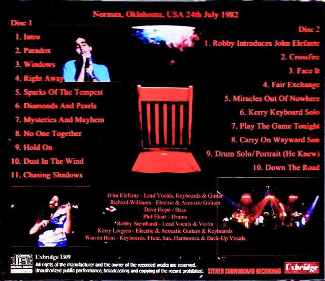 Disc 2(44:47) 01. Robby introduces John Elefante 02. Crossfire 03. Face It 04. Fair Exchange 05. Miracles Out Of Nowhere 06. Kerry keyboard solo 07. Play The Game Tonight 08. Carry On Wayward Son 09. Drum Solo / Portrait (He Knew) 10. Down The Road