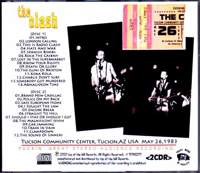 伝説のUSフェスティバルの2日前、83年5月アリゾナでのライブを高音質ステレオ・オーディエンス録音で完全収録した新発掘音源が初登場!ミック・ジョーンズのラストステージとなった伝説のUSフェスティバルの2日前、83年5月26日、アリゾナ州タクソン・コミュニティセンターで行われたライブを高音質ステレオ・オーディエンス録音で完全収録した新発掘音源が初登場!同日の音源は不完全なものや音質の悪いピッチのズレたものなどがありましたが、遂に極上マスターを発掘!!マスターカセットからダイレクトにデジタルトランスファーされており、マスターに起因するピッチのズレも丁寧に修正されています。レンジも広くヴォーカルはもちろん各パート共に非常にバランス良く、当時のものとしては上級クラスと言えるクリアな高音質サウンドで堪能できます!トッパー脱退後間もなく見事なサポートを務めバンドの危機を救った初代ドラマーであるテリーチャイムスに替わってジョーンズ脱退後のクラッシュラストアルバム『CUT THE CRAP』も含め5人組となった最後のクラッシュのドラマーも努めたピート・ハワードがドラムスになって直後のライブで、USフェスでもプレイされなかった非常にレアな"Lost In The Supermarket"、バンド初期のナンバー"Hate And War"、そしてラストにはレアな"The Sound Of Sinners"という魅力的なセットリストもさる事ながら非常にエネルギッシュでパワフルなパフォーマンスを披露しており、オーディエンスの熱狂ぶりも含め迫力抜群の高音質サウンドで封じ込めたファン悶絶必死のキラーアイテム!!
