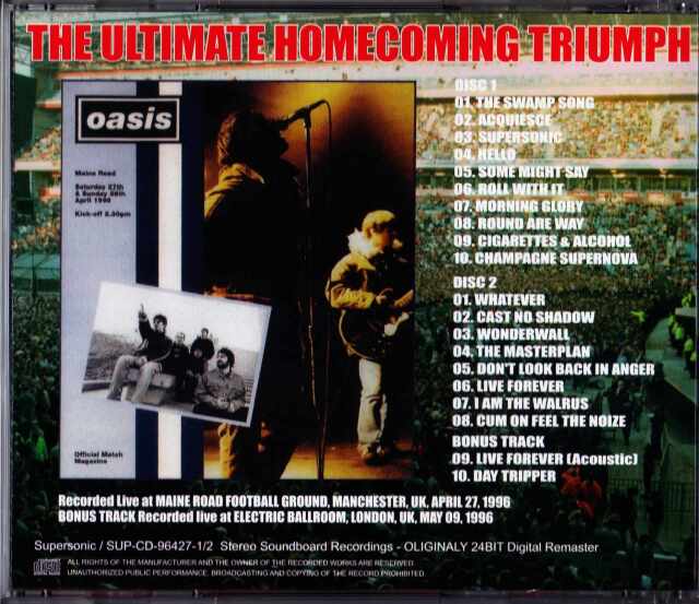 オアシス三大ギグのひとつとして名高い、ファンにとってはあまりに有名な1996年地元マンチェスター・メインロード公演の1日目27日の模様をサウンドボードで収録!!4月27-28日の2日間に亘って行われたこの公演は約6万人を動員し、まさにUKのビッグバンドに上り詰めた絶頂期の輝かしい記録でもあります。このメインロード公演で、オアシスにはまるきっかけとなったファンも多く、とにかく絶大なパワーに終始圧倒されること間違いなし。そして今回、満を持して今回SUPER SONICレーベルからリリースされたこのアイテムは、24BITリマスタリング+チャプターを打ち直し、サウンドは一枚ベールを剥がしたようにクリアになりました。このアイテムがあれば興奮の歴史的ギグが存分に楽しめるというわけで、OASISファンはもちろん、全ロックファンマストのすばらしい逸品に仕上がっております。この日は何と言ってもリアムの調子が非常によく、演奏もかなりまとまった聞き応えのある内容。 冒頭のThe Swamp Songから大歓声が上がり、それに応えるかのようにリアムが曲中で「Manchester, Maine Road mad for it!!!」と叫びます。 もちろん地元だけあり全曲大合唱状態。 Hello-Some Might Say-Roll With Itの流れはこの時期らしく「突っ走る」という感じで、ホントにものすごい勢いです! その勢いがMCにも随所に現れていて、Round Are Wayのあとのリアムのしゃべりも全くでたらめで意味不明。 前半と打って変わって、後半ではノエルのアコギを中心としたセット。 Whateverからの4曲はストリングス入りで、このアレンジで演奏されたのはこれが最初。 因みにこの日のCast No Shadowは会場に来ていたSTONE ROSESのジョン・スクワイアに捧げられてます。 また、Wonderwallはノエルが「メグに捧げる」と言い、リアムに冷やかされてたりしてます。 そして、I Am The Walrusが始まる前に何を思ったかノエルがD'Yer Wanna Be A Spaceman?をつま弾き、 リアムがほんの一瞬歌うという非常に珍しい場面も。 そのI Am The Walrusもブラスセクションやハーモニカも入ってかなり熱い! そして、ラストはサッカーでおなじみのCum On Feel The Noize。 この曲のライブバージョンは、このメイン・ロード2日間と、1995年に「Later With Jools Holland」に出演した際に ノエルが歌ったものしかありません。途中マイクを投げ飛ばしてリアムが歌わなくなり、ノエルのコーラスだけが続いたあと演奏は終了。 ギターのフィードバックをさせつつ、最後に観客に「To the greatest fans in the world, from the greatest band in the world. Good night!」という言葉を残してステージを去っていきます。 非常にテンションの高い突っ走った演奏で、初期オアシスの総決算とも言うべきライブ!!