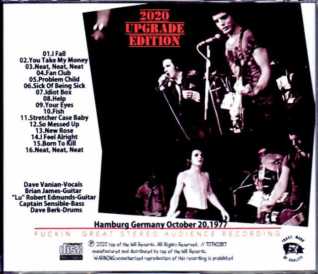 77年10月、ラットが去りデイブ・バークがドラムを代役をした秘蔵音源が音質アップした最新アップグレードバージョンで登場!2ndアルバム『Music For Pleasure』リリース直前の1977年10月20日、ドイツのハンブルグで行われたギグをステレオ・オーディエンス録音で収録した既発盤『STRETCHER CASE BABY -HAMBURG '77-(NEW MASTER/COMPLETE EDITION)(TOTH1582)』がマスターに使用されたカセットを最新デジタルコンバートによりさらに音質アップして再登場となります。既発盤でもこの当時としては非常に良好な音質でしたが、高域、低域共にさらにクリアで奥行きのある良好な音質に向上しています!キャプテンの旧知の仲というジョニー・モペットのドラマー、デイブ・バークがこの時期一時的にバンドを去ったラットの代役を努めており、加入直後のロバート・ルー・エドモンズを加えた短期間のみのレアな5人編成の時期のライブ。シングルの"Stretcher Case Baby"、"Sick Of Being Sick"も含め、デビューアルバムと2ndアルバムからセレクトされた最強のセットリストで、アンコールラストの"Neat, Neat, Neat"まで完全収録!ラット不在を感じさせない助っ人デイブの好サポートとツインギターがドライブしまくる凄まじいパフォーマンスを堪能できます!