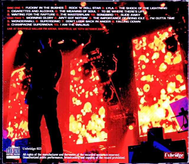 アルバム「Dig Out Your Soul」に伴う2008年ツアーより、リバプール公演に続く、UKツアー2日目、シェフィールド公演初日公演を極上オーディエンス録音で完全収録。トレーダー間でも一切出回っていないオリジナルDATマスターを使用したファン必携版が登場。先月、トロントでのフェスティバルでノエルがステージ上で暴漢に襲われて怪我をするという事件があり、当初はUKツアーの開始が危ぶまれていましたが、10月8日よりリヴァプールからスタートしたUKツアーでは、ノエルも含め、バンドはいつもどおりの素晴らしいライブを披露し、健在振りをアピールしてくれました。オープニングはRock 'N' Roll Star。新作からは6曲、Waiting For The Rapture、The Shock Of The Lightning、I'm Outta Time、Ain't Got Nothin''、To Be Where There's Life、Falling Down'がライブ披露されました。場内の雰囲気も素晴らしくMorning Glory、Wonderwall、Champagne Supernovaといった名曲での大合唱には感動させられます。ショウ後半ではDon't Look Back In Angerがアコースティック・ヴァージョンで披露され、会場内の感動的なムードを煽ります。ショウラストはビートルズ・カバーI Am The Walrus。現在も大規模なUKツアーを敢行中のオアシスはこれからヨーロッパ、南米、アメリカ、そして2009年初頭は大規模なヨーロッパ・ツアー。更には6月にウェンブリー・スタジアム3日間を含む巨大なスケールのUK&アイルランド・スタジアム・ツアーが決定しています。最新ライブ音源を、オリジナル・マスターより極上レベルの音質で捉えた決定版。世界中のオアシス・ファン必聴の高品質音源が登場です。
