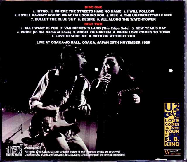 時代の寵児に登り詰め、6年ぶりに日本へ戻ってきた1989年のU2。あの栄光の来日公演を伝えるオリジナル・マスターが新発掘。そんな本作に吹き込まれているのは「1989年11月29日:大阪城ホール」公演。1989年のU2と言えば、『THE JOSHUA TREE』『RATTLE AND HUM』の2作連続で全米・全英1位を成し遂げ、押しも押されもしない超大物。B.B.キングと共に世界を巡った“LOVETOWN TOUR”の一幕を記録した絶品オーディエンス録音です。その来日ツアーは洋楽シーンに残る一大イベントだっただけに、当店でも数々の傑作ライヴアルバムでアーカイヴしてきました。まずは、そのコレクションを整理する意味でも当時のスケジュールから振り返ってみましょう。・11月23日:横浜アリーナ『WHEN LOVE COMES TO JAPAN』・11月25日:東京ドーム『TOKYO DOME 1989 1st Night: MASTER』・11月26日:東京ドーム『LOVE RESCUE ME』・11月28日:大阪城ホール・11月29日:大阪城ホール ←★本作★