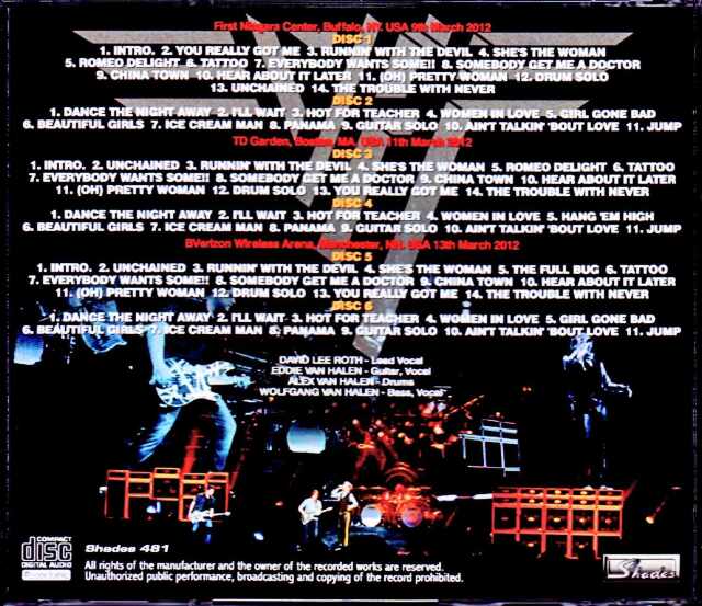 ……と、このようになっています。固定の18曲を軸としながら6曲を入れ替えてバラエティを作っています。「Hear About It Later」「The Trouble With Never」の2曲は本作の3公演では共通なものの、全公演固定ではない日替わり曲でした。中でも激しくレアなのが「Hang 'Em High」。1982年から30年ぶりに復活しつつ、再結成時代に演奏されたのも2回だけ(本作のボストン公演と3月28日ワシントンD.C.公演)。そんな超・激レア曲を素晴らしいサウンドで楽しめるのです。また、レア曲以外にもインパクトがあるのは「3月9日バッファロー公演(DISC 1-2)」のオープニング。このツアーは「Unchained」がポールポジションというイメージがありますが、ここでは「You Really Got Me」でスタート。2007年/2008年の残り香となるわけですが、この勢いのあるオープニングと新曲入りの新鮮さが同居しているショウでもある。サウンド面でも、内容面でも、本作で一番聴き応えのあるショウなのです。デイヴィッド・リー・ロスとの再結成も9年に及び、時期によってそれぞれに異なる味わいがありました。その中でも特に個性的だったのは、2012年だったかも知れません。デイヴと28年ぶりの新作を全米2位に送り込んだ順風満帆なムード、毎日セットを替える余裕。そんな1日1日がフレッシュだったツアーを現場体験できるのです。当時は認識していませんでしたが、1日1日が面白いからこそリアルタイムでの併走リリースも可能だった。そんな充実の6枚組。
