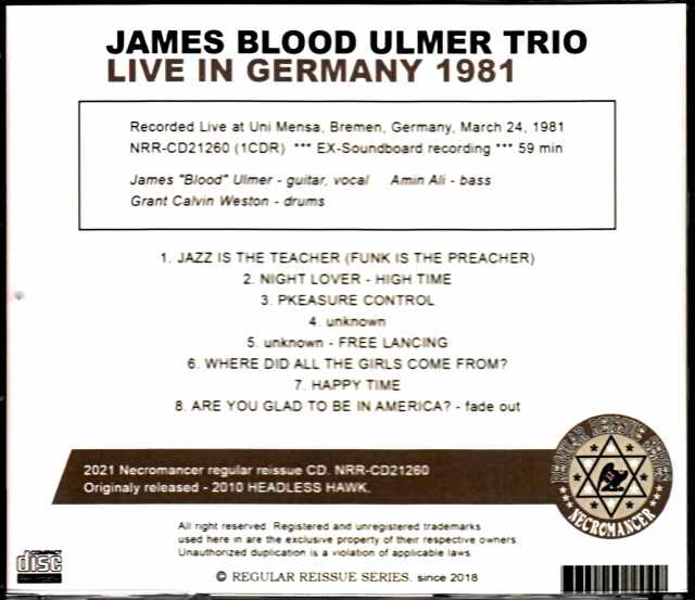 ジェームス・ブラッド・ウルマーのサウンドボード・ライヴ音源です。最も人気の『ARE YOU GLAD TO BE IN AMERICA?』から『FREE LANCING』期で、『FREE LANCING』のセットリストを『ARE YOU GLAD TO BE IN AMERICA?』の“ジャズ・イズ・ザ・ティーチャー”と“アー・ユー・グラッド・トゥ・ビー・イン・アメリカ?”で挟んだ選曲。新機軸を見出し始めていたヴォーカル曲と真骨頂のハーモロディック・ギターが存分に楽しめるインスト曲が程よく混じっています。ハーモロディック・ギターと三位一体となり得体の知れない推進力を発揮するのはアルバム収録時と同じアミン・アリとカルヴィン・ウェストンのリズム隊です。オーネット・コールマンの弟子として知られるウルマーですので、オーネットのファンの方も是非聴いてみてやってください。Recorded Live at Uni Mensa, Bremen, Germany, March 24, 1981 *** EX-Soundboard recording *** 59 min