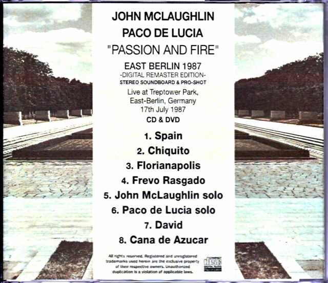 (CD+DVD) 01. Spain 02. Chiquito 03. Florianapolis 04. Frevo Rasgado 05. John McLaughlin solo 06. Paco de Lucia solo 07. David 08. Cana de Azucar