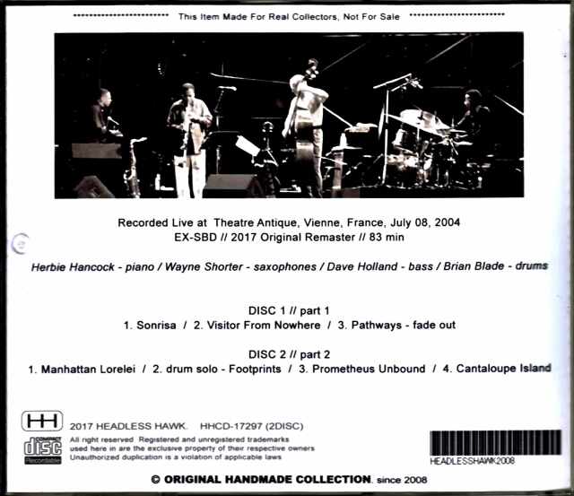 Live at Theatre Antique,Vienne,France July.08.2004 EX - SBD 2017 Original Remaster 83 min Disc 1 Part 1 1. Sonrisa 2. Visitor from Nowhere 3. Pathways - fade out Disc 2 Part 2 1. Manhattan Lorelei 2. Drum solo - Footprints 3. Prometheus Unbound 4. Cantaloupe Island