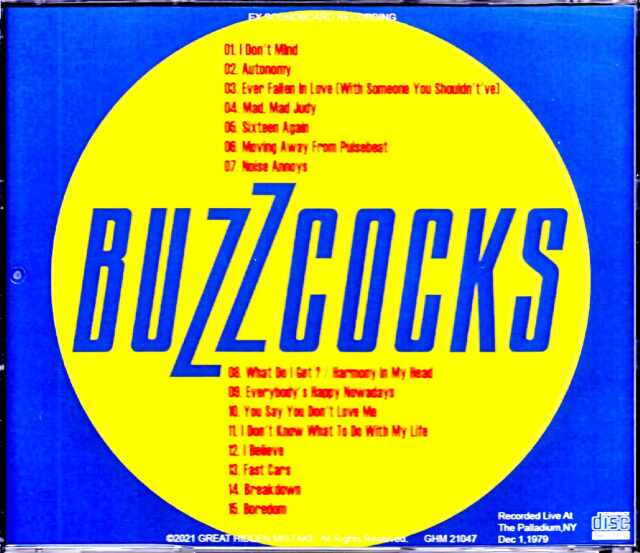 バズコックスの79年ニューヨーク公演のブロードキャスト音源が登場。放送用音源ということもあり音像もはっきりとしていて、初心者の入門にもってこいです。1992年のイタリア既発盤が存在しますが、2021年の最新リマスター音源が本作。「ラヴユーモア」はカットされておりますが、ハワードディボートがヴォーカルをとっていた初期のパンククラシック、「ブレイクダウン」「ボアダム」の聴衆の熱気も存分に伝わり、ジョン・マーやガーベイのリズム隊の演奏も勢い申し分なし。3枚のアルバムから散りばめられたファン納得のセットリスト。初期パンクファンには堪らない「ファストカーズ」からの怒涛のクラシック連発を是非爆音で多能してほしい。ピートシェリーのMCを聴くことができて涙腺がというコアなファンはマストバイです。Recorded Live At The Palladium,NY Dec 1,1979