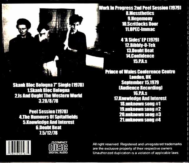 Skank Bloc Bologna 7" Single (1978) 1.Skank Bloc Bologna 2.Is And Ought The Western World 3.28/8/78 Peel Session (1978) 4.The Humours Of Spitalfields 5.Knowledge And Interest 6.Doubt Beat 7.5/12/78 Work In Progress 2nd Peel Session (1979) 8.Messthetics 9.Hegemony