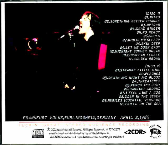 8枚目のアルバム『AURAL SCULPTURE』リリース時のツアーから85年4月ドイツ公演を良好なステレオ・オーディエンス録音で収録したレア音源が登場!ホーンセクションを導入して新境地を切り拓いた84年11月リリースの8枚目のアルバム『AURAL SCULPTURE』リリース時に行われたツアーから85年4月2日、ドイツ、フランクフルトで行われたライブを良好なステレオ・オーディエンス録音で収録したレア音源を最新リマスタリングにより格段に音質アップして新登場!マスターの音質は低域寄りでしたがリマスタリングにより低域、高域共にバランス良くレンジの広い抜けの良いサウンドで堪能できます。オープニングのSEから収録されており、『AURAL SCULPTURE』からの6曲をフィーチャーしたセットリストでアルバム同様にホーンセクションのサポートメンバーを加えた編成で行われています。アンコールでは80年にファンクラブ限定でリリースされたシングル『Tommorrow Was The Hereafter』のBサイドトラック"Nubiles (Cocktail Version)"もプレイされており、初期のナンバー"Nice 'n' Sleazy"や"Peaches"などもホーンを入れたアレンジでプレイされておりこの当時ならではの豪華な編成によるパフォーマンスをノーカット完全収録!Frankfurt Volks,Burlingsheim,Germany April 2,1985