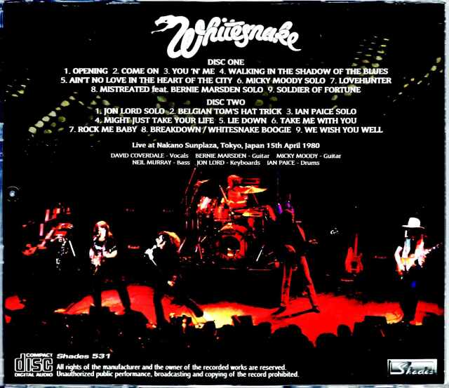 Disc 1 (49:36) 1. Opening 2. Come On 3. You 'n' Me 4. Walking In The Shadow Of The Blues 5. Ain't No Love In The Heart Of The City 6. Micky Moody Solo 7. Lovehunter 8. Mistreated feat. Bernie Marsden Solo 9. Soldier Of Fortune