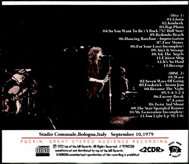活動休止直前最後となった79年9月、イタリアでのライブを良好なステレオ・オーディエンス録音で収録した秘蔵音源が登場!4枚目の名作『WAVE』リリースから約4ヶ月後である79年9月10日、イタリア北部に位置するボローニャにある約38000人を収容する屋外陸上競技場スタディオ・コムナーレで行われたライブを良好なステレオ・オーディエンス録音で収録した秘蔵音源が登場! マスターに使用した音源は高域寄りで平坦な音像でしたがリマスタリングによりクリアな音像になっています。粗めの音像ながらレンジの広いステレオでヴォーカルも大きく、各パート共にバランス良く収録されています。ヤードバーズのカバー"For Your Love"とザ・フーのカバー"My Generation"で僅かに欠落があります。イタリアのフィレンツェで開催されたイベントでこの日が「ウェイブ・ツアー」の最終日でオリジナルメンバーによるパティスミス・グループとしての最後のライブ。パティはライブの序盤にステージ前方のカメラマン用のピットをオーディエンスに開放してしまいますが、これが災いして観客と警備員が喧嘩を始めてしまうというトラブルも収録され、終盤ではステージに押し寄せるオーディエンスの影響で電気がストップ、ラストの"You Light Up My Life"はピアノのみでプレイされており、演奏を中断してステージに押しかけるオーディエンスを諭すシーンでテープは終了しています。約132分のラストパフォーマンスを封じ込めたレア・アイテムです!Stadio Comunale,Bologna,Italy September 10,1979