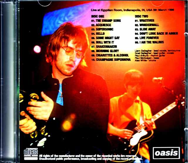 フェアファックスの前のギグだった3月5日のショーを収めたCDそんな96年のインディアナポリスはDATを用いたオーディエンス録音。全体的に音像が遠め(特にギグ前半)でオープニング「The Swamp Song」の最中ではDATの経年から生じたと思われるノイズが混入しているのが玉に瑕ですが、音質はマイルドで十分にクリアー、なおかつ周囲に騒ぐオーディエンスもいないので、これならマニアでなくともストレスなく聞きこめるかと。この日の演奏を聞いていて何より驚かされるのが、フェアファックスと打って変わってギャラガー兄弟の口数が少ないということ。あれだけ放送では二人して絶叫に近いレベルで饒舌にオーディエンスに向かって語りかけていたのに対し、この日の曲間では彼らのMCが非常に少ないのです。特にリアムは曲名を発する程度で、これだけはっきりとした差があるという事実だけでも聞いていて非常に面白いものがあります。かといって演奏がテンション低いという事は(まったく!)なく、むしろショーが淡々と進行している印象を受ける一方でリアムの調子も非常によく、どの曲も無理なく歌いこなしている。フェアファックスが放送禁止用語もお構いなしにあれだけ振り切れていただけに、口数少なめでサクサクこなしている反面、演奏そのもののテンションは非常に高いという不思議なコントラスト。やはりフェアファックスはラジオ用の収録が行われるということを意識して二人のテンションがあそこまでハイになっていたのであり、ツアーの通常営業モードとしてはこんな感じだったのか…ということを垣間見させてくれるドキュメントでしょう。つまり演奏自体の手抜き感は一切なく、リアムはもとよりノエルも弾き語りコーナーでは熱唱しており、中でも「Slide Away」は素晴らしい。おまけにオーディエンスも良く盛り上がっていて、時折起こる合唱も嫌味のないバランスで捉えてくれている。もちろん遠めな音像である以上レベルと呼べないのは事実ですが、それでも十分楽しめるのが本音源。言うなれば「陽」のフェアファックスに対して「陰」のインディアナポリスとでも例えれば良いでしょうか。稀代の名音源フェアファックスとのビフォーアフターぶりが楽しめる1996年アメリカ・ツアーからの貴重音源。Egyptian Room, Indianapolis, IN, USA 5th March 1996 PERFECT SOUND