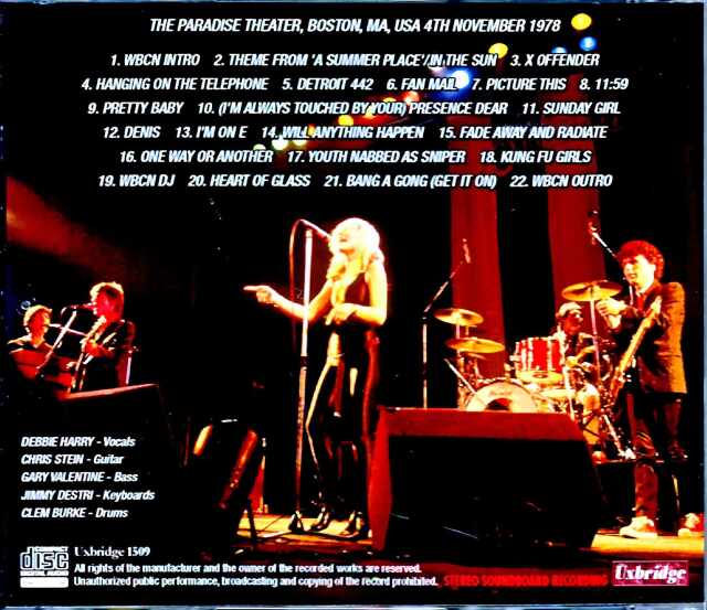 ・10月10日:ポーツマス公演・10月13日ー12月3日:北米#2(19公演)←★ココ★・12月29日ー31日:北米#3(3公演) これが1978年のBLONDIE。1978年と言えば『PARALLEL LINES』のリリース年ではありますが、シングル『Heart of Glass』がヒットしたのは1979年になってから。本作のボストン公演はちょうどその間となるアルバム発売直後。「北米#2」の5公演目。公式ライヴ盤『PICTURE THIS LIVE』にも一部で1978年フィラデルフィア公演が使われていましたが、あれは“11月6日”。本作は、その2日前という直近のコンサートでもありました。そんなショウはラジオ放送された事でも知られ、以前からFMサウンドボードが定番となってきました。本作も同じFM放送ではありますが、既発のコピーやリマスターではありません。ごく最近になって発掘されたリール・マスターなのです。そのクオリティは、まさに最高峰。既発をご存知の方ならオフィシャル作品風と言うよりは、70年代のアナログ感に溢れたミックスやサウンドをご記憶だと思いますが、あれは放送自体の個性。本作でもあの暖かいヴィンテージ感を湛えつつ、マスター鮮度が絶大。綺麗に伸びる鳴りに歪みやヨレが感じられず、瑞々しさたっぷり。それこそ、43年の時空を飛び越えて放送電波を直接受信しているかのような懐かしさ。端麗だけれど辛口ではなく、優しい甘みの美音なのです。そんな豊かなサウンドで描かれるのは、初期の薫りを残しつつ、BLONDIEを象徴する代表曲がグッと増えた美味しいショウ。70年代末のライヴと言えば、何よりも公式盤『PICTURE THIS LIVE』。ここで比較しながら整理してみましょう。囁きのブロンディ(6曲)・Detroit 442(★)/Fan Mail(★)/