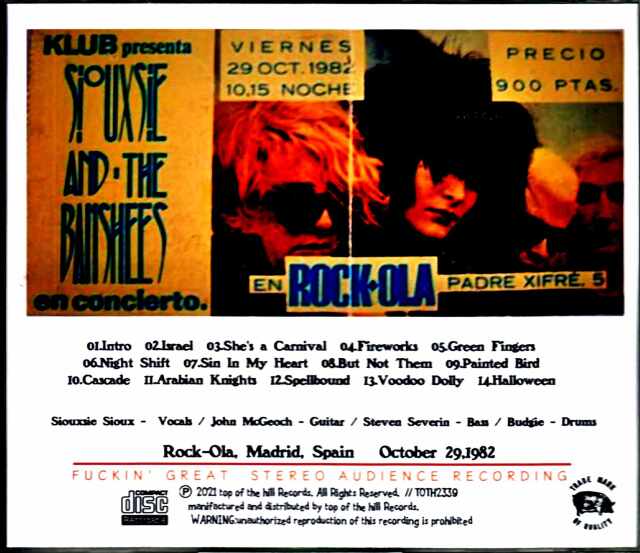 ジョン・マクガフ在籍時のラストライブとなった82年10月、マドリッド2デイズ公演の初日のライブを良好なステレオ・オーディエンス録音で収録した秘蔵音源が登場!5作目のアルバム『キス・イン・ザ・ドリームハウス』リリースを数日後に控えた82年10月29日、スペイン、マドリッドのナイトクラブ、ロック・オラで行われた2日連続公演の初日のライブを良好なステレオ・オーディエンス録音で収録した秘蔵音源が登場! この音源は2つのソースが存在しており、本作ではレンジの広いステレオで収録されているソースをメインに使用し、欠落している"Halloween"をもうひとつのソースで補填しリマスタリング収録しています。粗めな箇所もありますが、ヴォーカルを含め各パート共に非常にくっきりとクリアに収録されています。 同年5月にリリースしたシングル"Fireworks"、そして当時の新作『キス・イン・ザ・ドリームハウス』から4曲、スージーとバッジーによるザ・クリエイチャーズのEPに収録された"But Not Them"を含めたセットリストで、この2デイズ公演を最後にアルコールによる自身の問題でバンドを去ったジョン・マクガフのラストライブとなってしまったとは思えない緊張感のある最高のパフォーマンスを披露しています!Rock-Ola, Madrid, Spain October 29,1982