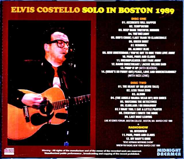 1989年エルヴィス・コステロのUSソロ・ツアーから3月31日ボストン公演が極上高音質オーディエンス録音マスターからの収録で登場!バンドと違ってアンプラグド・スタイルによるソロ演奏で曲によってはビートルズ「悲しみはぶっとばせ」やモンキーズの「恋の終列車」等がメドレー披露された他、オープニング・アクトを務めたニック・ロウもゲスト参加。さらに同日ラジオ放送された”デイブ・ハーマン・モーニング・ショウ”でのインタビュー&ライブも追加収録されたお薦めタイトルです!Live At Conte Forum , Boston College , Boston, MA March 31st 1989