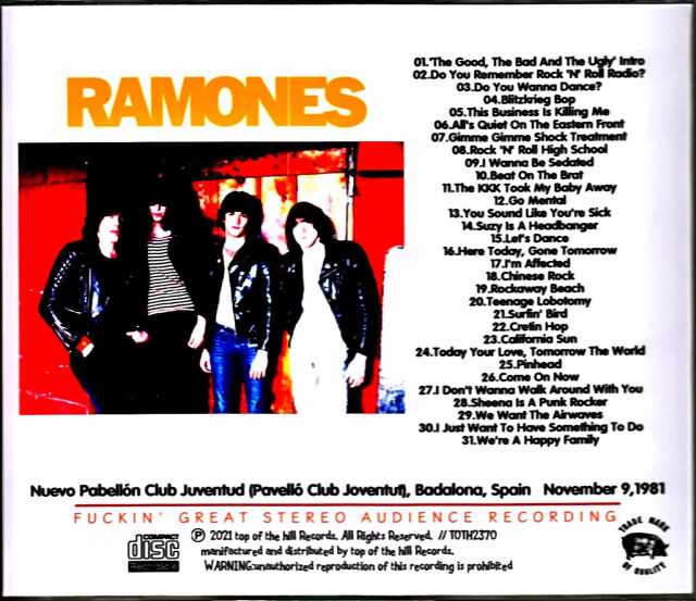 6枚目のスタジオ作『PLEASANT DREAMS』リリース時のツアーから81年11月スペイン公演を良好なステレオ・オーディエンス録音で完全収録したレア音源が登場!81年の『PLEASANT DREAMS TOUR』から11月9日、スペイン、バダロナで行われたライブを良好なステレオ・オーディエンス録音で完全収録したレア音源が登場!ロウジェネマスターからデジタル・トランスファーされたマスターを使用しており、若干粗めではあるものの当時のものとしては上級クラスと言えるレンジも広く奥行きもあるクリアな音像でジョーイのヴォーカルが大きめでドラムのシンバルやキックなども含め各パート共に非常にバランスよく、ジョニーのギターがラウドに響き渡る迫力抜群の音質で収録されています。またマスターに起因するピッチのズレは丁寧に補正されています。オープニングを告げる『続・夕日のガンマン』のテーマのSEからメンバーがステージに現れるシーンから収収録されており、シングルカットされた"The KKK Took My Baby Away"、"We Want The Airwaves"を含め同年7月にリリースされた6枚目のスタジオ作『PLEASANT DREAMS』からの6曲をフィーチャーしたセットリストで、同年10月のライブを収録した『COPENHAGEN 1981』では欠落箇所があった"Gimme Gimme Shock Treatment"と"Rock 'N' Roll High School"は欠落なく収録し、最初のアンコールの歓声部分でテープチェンジしているので2度のアンコールも含め全曲欠落なく最後のアンコール完"We're A Happy Family"後の終焉を告げるSEが流れるところまで全収録されています。Nuevo Pabellón Club Juventud (Pavelló Club Joventut), Badalona, Spain November 9,1981