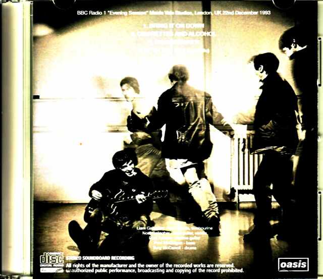 また「Cigarettes & Alcohol」などはデビュー後のバージョンと比べてテンポが遅く、そのせいで元ネタとなったT・レックスの「Get It On」っぽさが強まっているのが微笑ましい。一方「Shakermaker」は既にファースト・アルバムの世界観を漂わせており、トレードマークとなったリアムの特徴的な歌いっぷり冴えわたっている。そこは後の偉大さを予見させるに十分な演奏となっています。そして「Up In The Sky」は「DEFINITELY MAYBE」20周年記念盤のアレンジに近いアコースティック・バージョンですが、ここではリアム・ボーカルな上に彼の声がダブルトラックという凝った仕上がり。よって純然たるスタジオライブとは言い難いのですが、ブリットポップの狼煙を上げた1994年以前のオアシスを捉えた貴重音源であり、なおかつ最高のステレオで収録されているのもポイントが高い。それ故オアシスの初期音源ものコンピレーションでは好んで選ばれていたラジオ音源の一つでもあるのですが、リアタイでリリースされたのもの中にはピッチが低くて音質が荒いといったバージョンもあった。その後より音質の向上されたバージョンがリリースされてもいますが、今回は彼らのラスト・アルバム「DIG OUT YOUR SOUL」リリース時の2008年に再放送されたバージョンから収録されているので音質はオフィシャルそのものといえるハイクオリティ。わずか四曲かつ20分に満たない収録時間ではありますが、初期オアシスの貴重音源を収めた文字通りのハイクオリティCDです!BBC Radio 1 "Evening Session" Maida Vale Studios, London, UK 22nd December 1993 STEREO SBD (17:03)