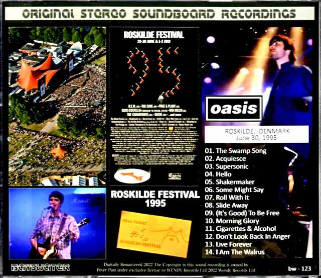 ロスキルド・フェスティバルは、デンマークのロスキレにて毎年行なわれている野外音楽フェスティバルで、一般的にはロスキレ(Roskilde)と簡略化されて呼称される。広大な敷地に6月末から7月初頭にかけ1週間もの長期にわたって開催される、北欧最大の音楽フェスティバルである。本作はそのロスキレ・フェスに1995年に出演したオアシスのステージを完全収録している。オアシスのロスキレ・フェスは、これまで「Behind Closed Doors」というタイトルで9曲のみサウンドボードで収録されていたが、本作はサウンドボード収録が11曲と増えている上に、欠落していた3曲を同日高音質オーディエンスにて補完し、当日のコンサートを完全収録している。AUD補完は欠落していた3曲にとどまらず、曲間の細かいMCなどを含め編集にて補完されており、まさに当日の時間軸そのままに完全収録している。サウンドボード2曲とオーディエンス補完3曲の計5曲は初登場である。かつて某雑誌レビューにて「このコンサートを聴いて興奮しない人はブートを買うのを一切やめたほうがいい」とまで絶賛された最高のステージであるロスキレ・フェスの拡大拡張盤が本作であると言える。1995年ロスキレ・フェス サウンドボード11曲+AUD3曲で完全収録。ROSKILDE, DENMARK June 30, 1995