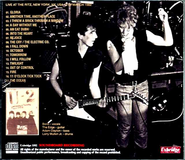 ・1月23日ー26日:アイルランド(3公演)・2月11日ー3月30日:北米#3(32公演)←★ココ★《9月ー11月『WAR』制作》・12月1日ー24日:欧州#5(20公演)これが1981年/1982年のU2。「欧州#3」から「北米#3」までが“OCTOBER Tour”とされていまして、“The Ritz”では「1981年11月20日・21日・22日」と「1982年3月17日・18日」の計5公演が実施されました。本作のニューヨーク公演はツアー終盤となる「北米#3」の23公演目にあたるコンサートでした。そんなショウはサウンドボード録音が残された事でも知られ、“OCTOBER Tour”の定番として愛されてきました。実際、本作のサウンドは定番になるのも当然の極上ぶり。サウンド・クオリティ自体は『HOLLYWOOD PALLADIUM 1981』にも負けていない……と言いますか、それこそ『OCTOBER』にセットしてデラックス・エディションとなってもおかしくないくらいです。そんな準オフィシャル級とでも呼ぶべきクオリティで描かれるのは、『HOLLYWOOD PALLADIUM 1981』を遙かに凌駕するフルショウ。ここで比較しながら整理してみましょう。ボーイ(9曲+α)・Another Time, Another Place/A Day Without Me/An Cat Dubh(★)/Into the Heart(★)/The Cry/The Electric Co./I Will Follow(★)/Twilight/Out of Control/The Ocean(★)アイリッシュ・オクトーバー(7曲)・Gloria/I Threw a Brick Through a Window/Rejoice/I Fall Down/October(★)/Tomorrow(★)/Fire(★)その他・11 O'Clock Tick Tock(★)※注;「★」印はサウンドボードの名盤『HOLLYWOOD PALLADIUM 1981』で聴けない曲。……と、このようになっています。『BOY』から「Stories for Boys」「Shadows and Tall Trees」以外の全曲が披露され、もちろん『OCTOBER』からも大盤振る舞い。「Another Time, Another Place」や「Rejoice」「Tomorrow」「Fire」等々。この時期だからこその美味しい名曲がてんこ盛りなのです。そして、そんなセットを綴る演奏こそが熱い。何しろ、当時の4人の平均年齢は20.5歳。後年の意識高い系バンドとはまるで違って丸出しのパッションが熱い一介のロックバンド。自分たちの音楽だけを信じて突き進むひたむきさがサウンドボードだけのド密着感で描かれていくのです。とにもかくにも、特濃で美味しい初期セットと若々しい熱演。それらを脳みそに直接流し込んでくるド密着サウンドボードの大傑作です。ステレオ感の醍醐味は『HOLLYWOOD PALLADIUM 1981』に譲りますが、フルセットの聴き応えは大きく凌駕する不可避の1枚。「1982年3月17日ザ・リッツ公演」のサウンドボード録音。モノラルなためにUxbridgeレーベルからのご紹介となりましたが、サウンド・クオリティ自体はオフィシャル級。そして何より嬉しいのがフル・ショウを完全収録していることです。『BOY』からの9曲を軸としつつ、『OCTOBER』からも7曲の大盤振る舞い。「Another Time, Another Place」や「Rejoice」「Tomorrow」「Fire」等々、この時期だからこその美味しい名曲がてんこ盛りのフルショウをサウンドボードで楽しめる絶対盤です。Live at The Ritz, New York, NY, USA 17th March 1982 SBD (70:43)