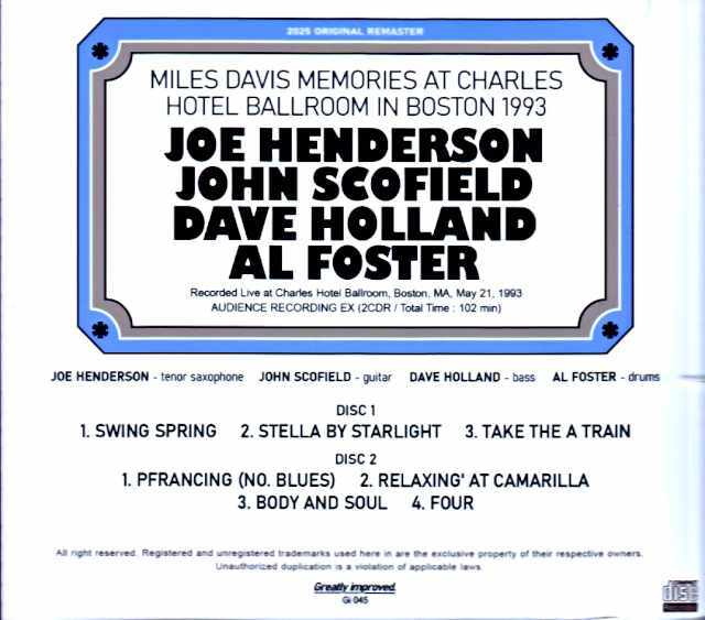 Joe Henderson John Scofield,Dave Holland,Al Foster ジョー・ヘンダーソン ジョン・スコフィールド/MA,USA 1993 Complete