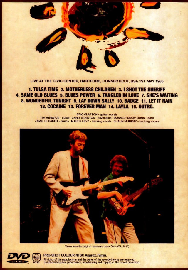 エリック・クラプトンの1985年春に行なわれた「ビハインド・ザ・サン・アメリカンツアー」から、かつてオフィシャルでリリースされた5月1日のコネチカット州ハートフォード公演のプロショット映像をお届けします!実はこの作品、85年当時VHSカセットとレーザーディスクで一度リリースされて以降再発されることなくすぐに廃盤となり、なぜか今日に至るまでDVD化もブルーレイディスク化もされていないのです。今では当時のハードウェアが姿を消しているだけに、手軽に観ることもままならぬ状況です。アルコール中毒を克服し、精悍なルックスとバイタリティ溢れるパフォーマンスで「二度目のカムバック」を果たしたとも言える1985年のエリック・クラプトンを克明に捉えた映像として、この「かっこいい」クラプトンに当時のファンは痺れたものですが、今ではそれを確認することができない状況なのです。なぜDVD化されていないのか、その理由は分かりませんが、これほど優れた映像を「アンプラグド」以降にファンになった方をはじめ、多くのファンに手軽に観ていただくため、当店がオフィシャルに成り代わりリリースしようというわけです。オフィシャル作品にはありがちなことですが、インパクトをもってコンパクトに編集してあるため、この映像では実際のコンサートで演奏されたクラプトンのリードナンバー4曲とバックコーラスを務めた二人の女性シンガーをフィーチャーした2曲がカットされているほか、レギュラーセットのラストで演奏されたLaylaとアンコールで演奏されたForever Manの曲順が入れ替わっていました。つまりコンサートそのままの完全収録ではないわけですが、それでもこの映像の素晴らしさは不変で、公式映像の「Live '85」を日本盤レーザーディスクからダイレクトにDVD化した本盤は、35ミリフィルムで撮影したと言われる映像らしい、この時代ならではのアナログ風の質感、そして音のミックスをラウドに収録しているのも特徴と言え、最高画質&音質にご満足いただけることは間違いないでしょう。ではここで、収録されたこのコンサートがクラプトンのキャリアにおいてどのようなタイミングで行なわれたものだったのか、このコンサート前後のトピックを時系列で見ていきましょう。