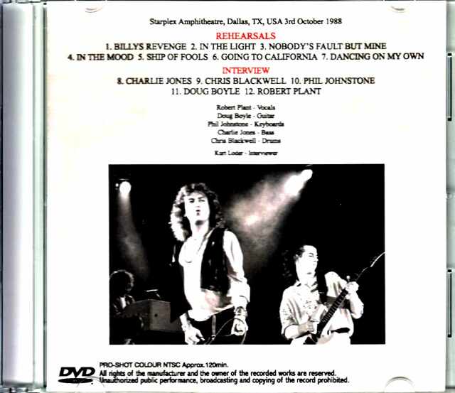・5月15日ー7月29日:北米#1b(45公演)・9月23日+24日:北アイルランド(2公演)《10月3日:リハーサル》 ←★ココ★・10月5日ー12月31日:北米#2(38公演)これが“NON STOP GO tour”の全体像。ツアー自体はとっくの昔に始まっており、本作は最終盤「北米#2」のために行われたもの。それだけにアンサンブルなどはすでに出来上がっており、演奏も本番さながら。プラントはバンドや照明に指示を出したりと現場監督の姿も見せますが、あくまで最終確認的なのです。そして、ポイントなのは演奏している曲。この時点であえてリハを行っているのは、恐らくセットの変更が原因なのでしょう。ツアー序盤から「Misty Mountain Hop」や「Trampled Under Foot」「Black Country Woman」などの解禁が話題となりましたが、ZEP再結成を経た「北米#2」では解禁枠が一気に拡大。「In The Light」「Nobody's Fault But Mine」も演奏されるようになるのです。特に「Going To California」はプラントのソロ・ステージでは大定番のようにも感じられますが、解禁されたのはまさにココ。本作で描かれるのは、そんな準備に勤しむプラントの姿なのです。また、その後のメンバー全員のインタビューも面白い。流出プロショットだけに字幕などはありませんが、意気込みやこれまでのツアーの想い出を語っていく。チャーリーやドラムのクリス・ブラックウェルはジミー・ペイジが飛び入りしたハマースミス公演に触れており、インタビュアと「きっとブートレグになるね」などと話し込んでいます。スタジオ作品でもなく、コンサート・ステージでもないリハーサル。表には出ないけれど、間違いなくプロフェッショナルなプラントの仕事姿が垣間見えるプロショットです。そんな貴重映像が1stジェネ・マスターでアップグレードした1枚。 Starplex Amphitheatre, Dallas, TX, USA 3rd October 1988 PRO-SHOT (1:59:33)