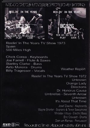 70年代以降のジャズ界を大きく方向付けた2大グループの初期映像が登場!!カリフォルニアのTV番組「Reelin' In The Years TV Show」からの流出のモノクロ映像で、タイム・カウンターと整理用?の番号が表示されてしまうのですが、元の画質音質は大変良好です。RTFはジョー・ファレル在籍時のもので、フローラがお休みでビリー・トラガッサーがヴォーカルという、貴重なラインナップ。WRはオリジナル三頭政治期のもの。がむしゃらに自分たちの音を追及する、この時期のWRが好きな方(私も!)は必見のライヴです。この時代ならではといいますか、両グループのどのメンバーも、高い志に燃え、激しく自己表現をしていて、すごい力で引き込まれてしまいます。収録時間は80分となります。